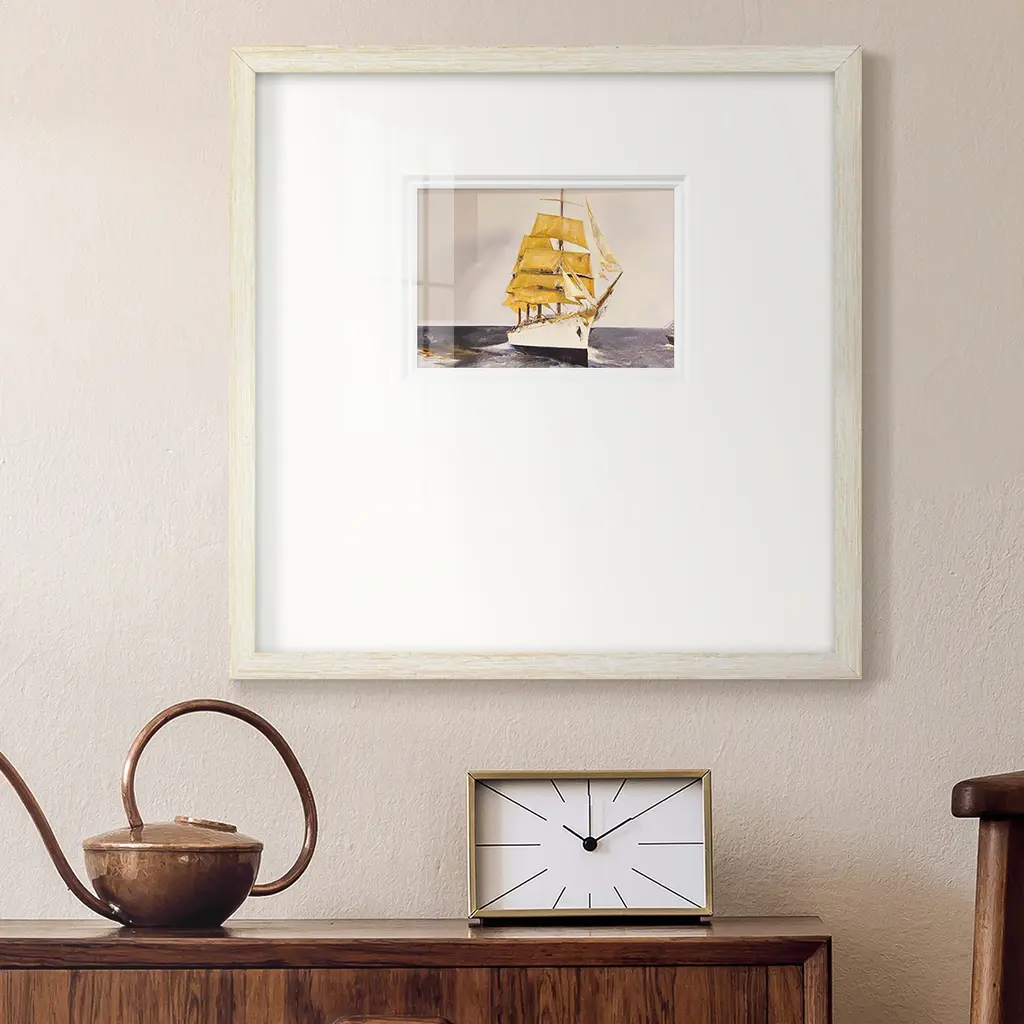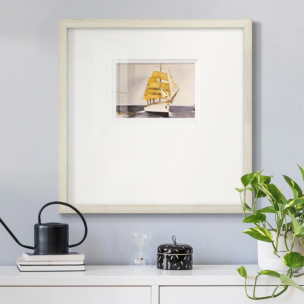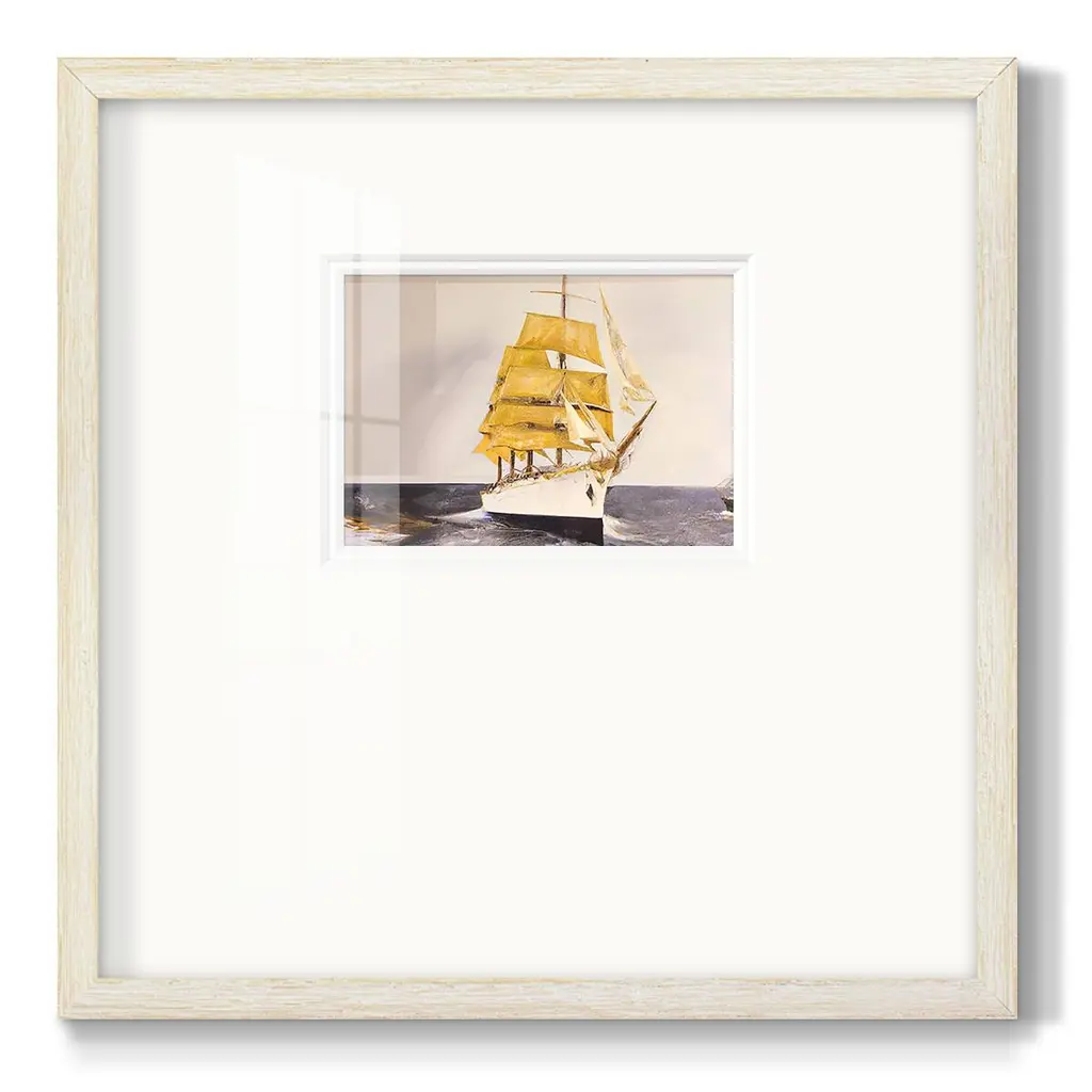 Golden SailorPremium Framed Print A framed cold pressed paper print featuring superior double matting and quality frame. 2 SIZES AVAILABLE 16''X16''' - Overall Size 20''X20''' - Overall Size Each piece is made to order. Each piece comes with hanging hardware. Made in the USA Ready to Hang Giclee Paper Print Plexiglass Beveled Matt Board Double Matte Board