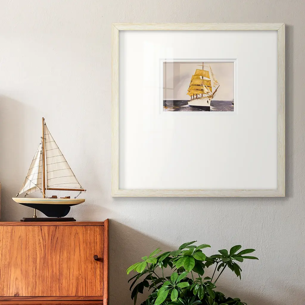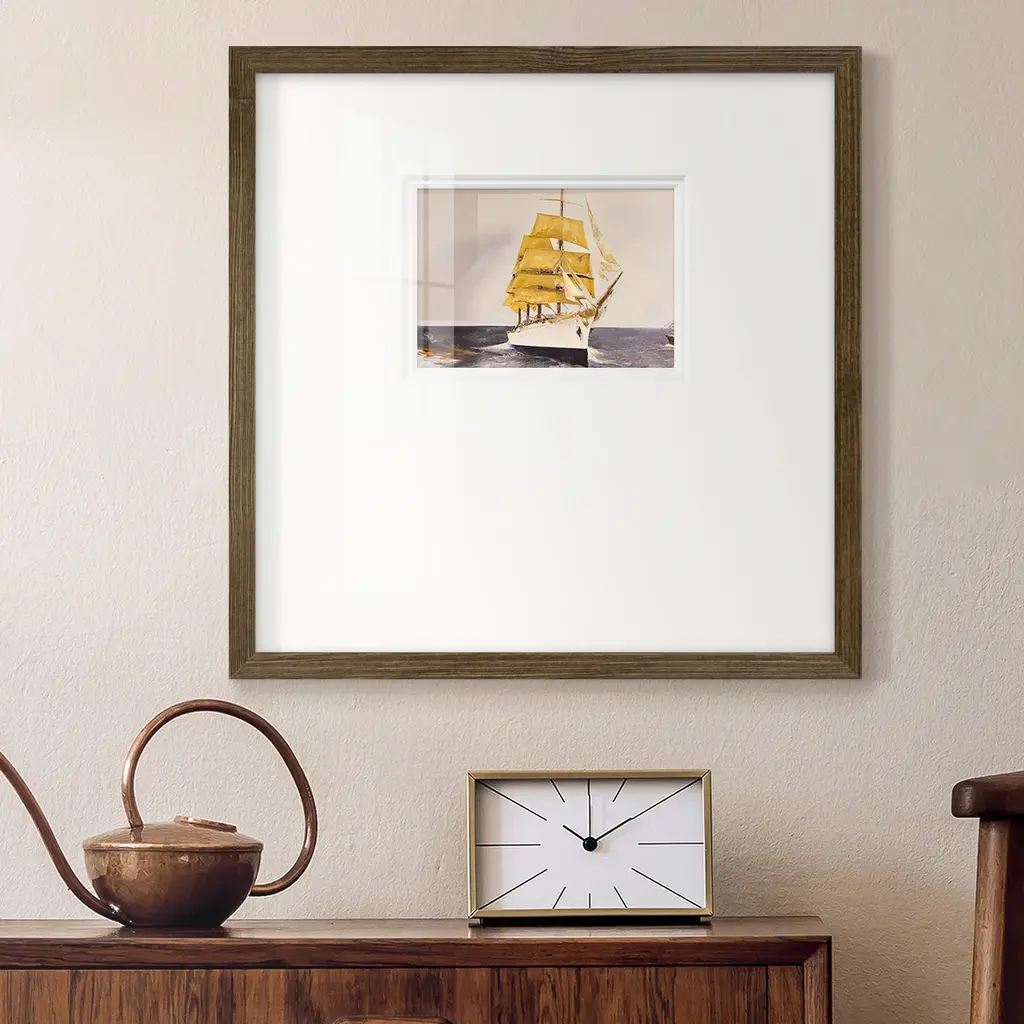Golden SailorPremium Framed Print A framed cold pressed paper print featuring superior double matting and quality frame. 2 SIZES AVAILABLE 16''X16''' - Overall Size 20''X20''' - Overall Size Each piece is made to order. Each piece comes with hanging hardware. Made in the USA Ready to Hang Giclee Paper Print Plexiglass Beveled Matt Board Double Matte Board