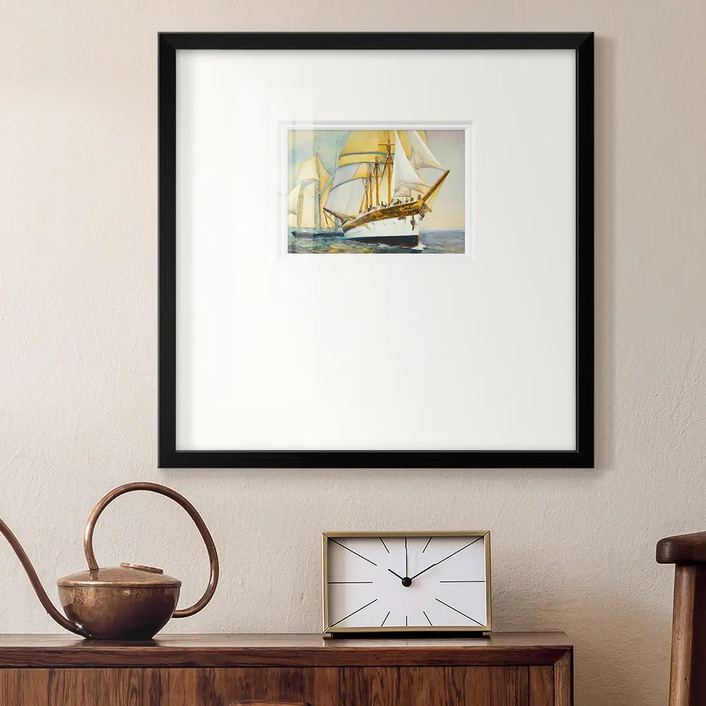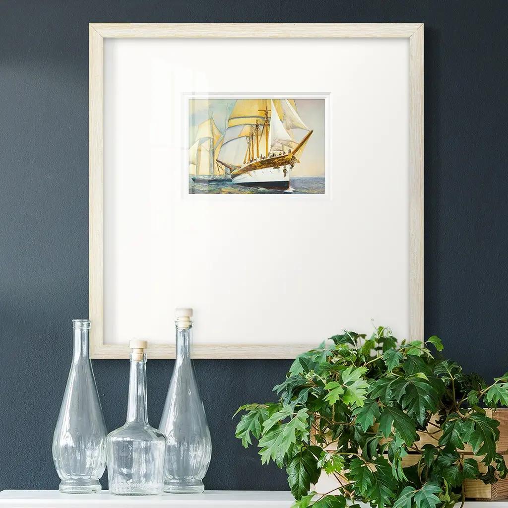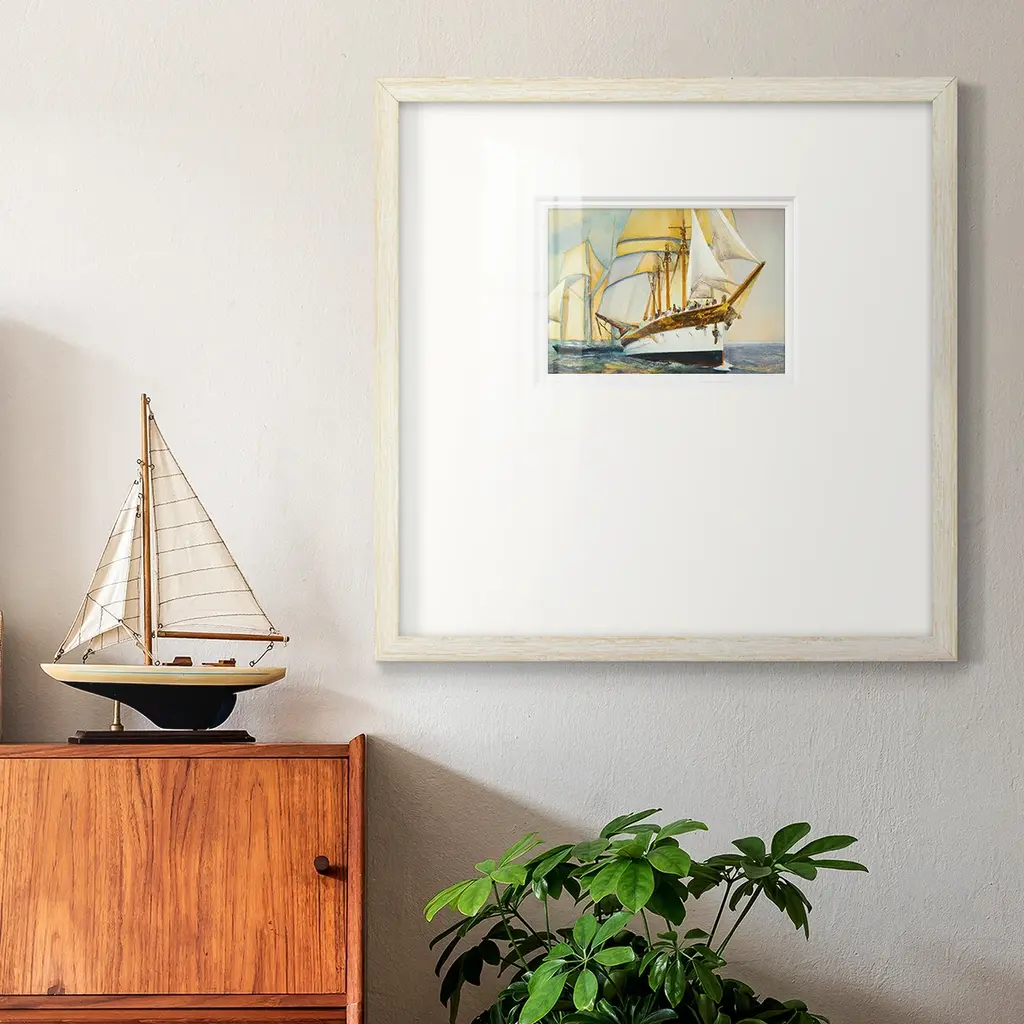 Golden Sailv IVPremium Framed Print A framed cold pressed paper print featuring superior double matting and quality frame. 2 SIZES AVAILABLE 16''X16''' - Overall Size 20''X20''' - Overall Size Each piece is made to order. Each piece comes with hanging hardware. Made in the USA Ready to Hang Giclee Paper Print Plexiglass Beveled Matt Board Double Matte Board