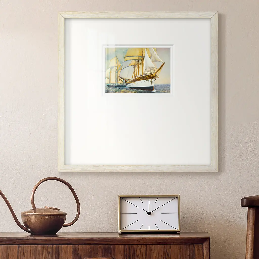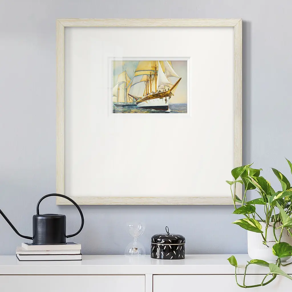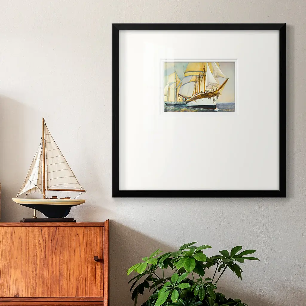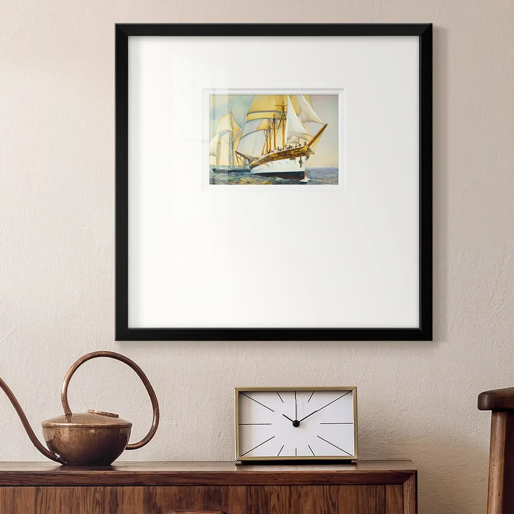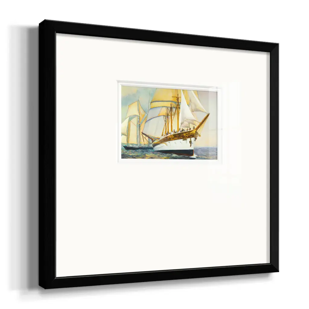 Golden Sailv IVPremium Framed Print A framed cold pressed paper print featuring superior double matting and quality frame. 2 SIZES AVAILABLE 16''X16''' - Overall Size 20''X20''' - Overall Size Each piece is made to order. Each piece comes with hanging hardware. Made in the USA Ready to Hang Giclee Paper Print Plexiglass Beveled Matt Board Double Matte Board