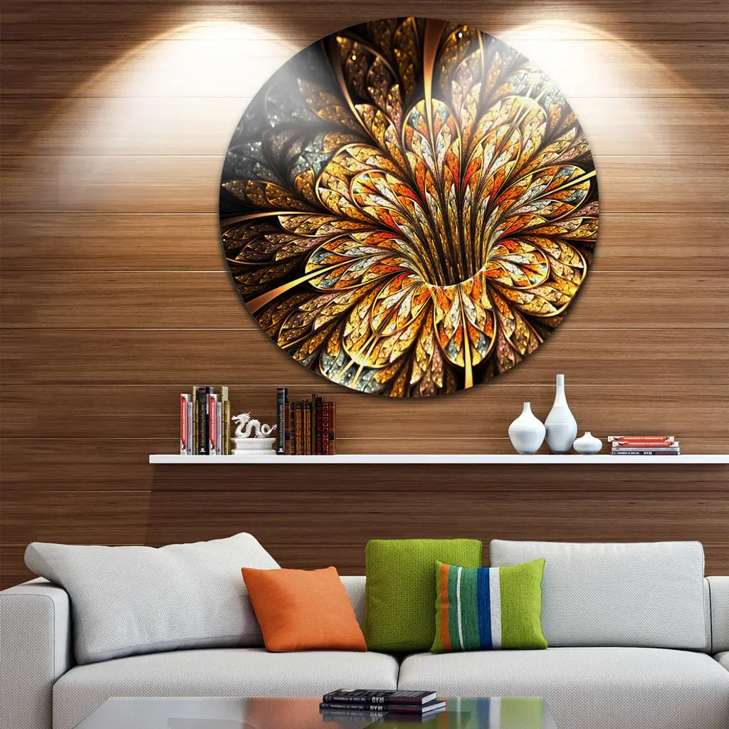 Bring Contemporary Abstraction to your home with this large Circle Metal wall art. This Golden Shiny Fractal Flower Metal Artwork makes it the focal point of any room or office. - White Gloss Coating ensures colors are extra vibrant with light reflection.- Aluminum grade Sheet Metal with 1 inch mounting frame on the back giving the illusion that the artwork is floating on the wall..- Mounting Brackets are included along with instructions.- High Quality Digital images are created directly into a glossy aluminum panel producing a stunning and captivating print into the glossy finish of the metal.- Water, Fire and Scratch resistant HD Aluminum panels.- Looks better than any photo paper and guaranteed to last at least 20 years- Easy to clean with a microfiber cloth. Colors are far superior to regular Canvas Art. - Easy to Hang