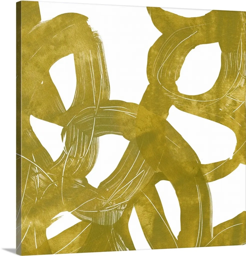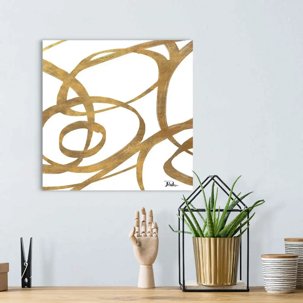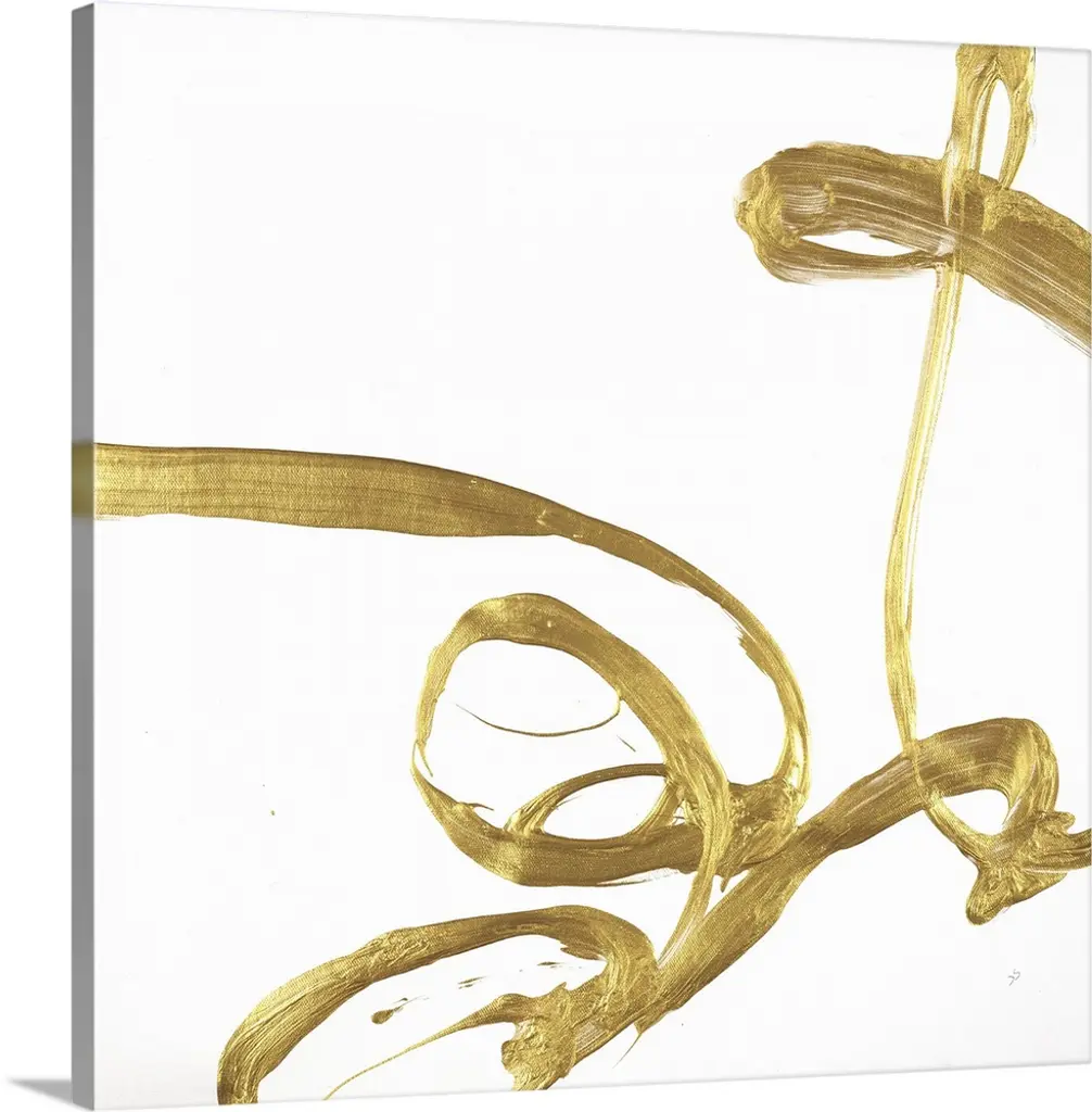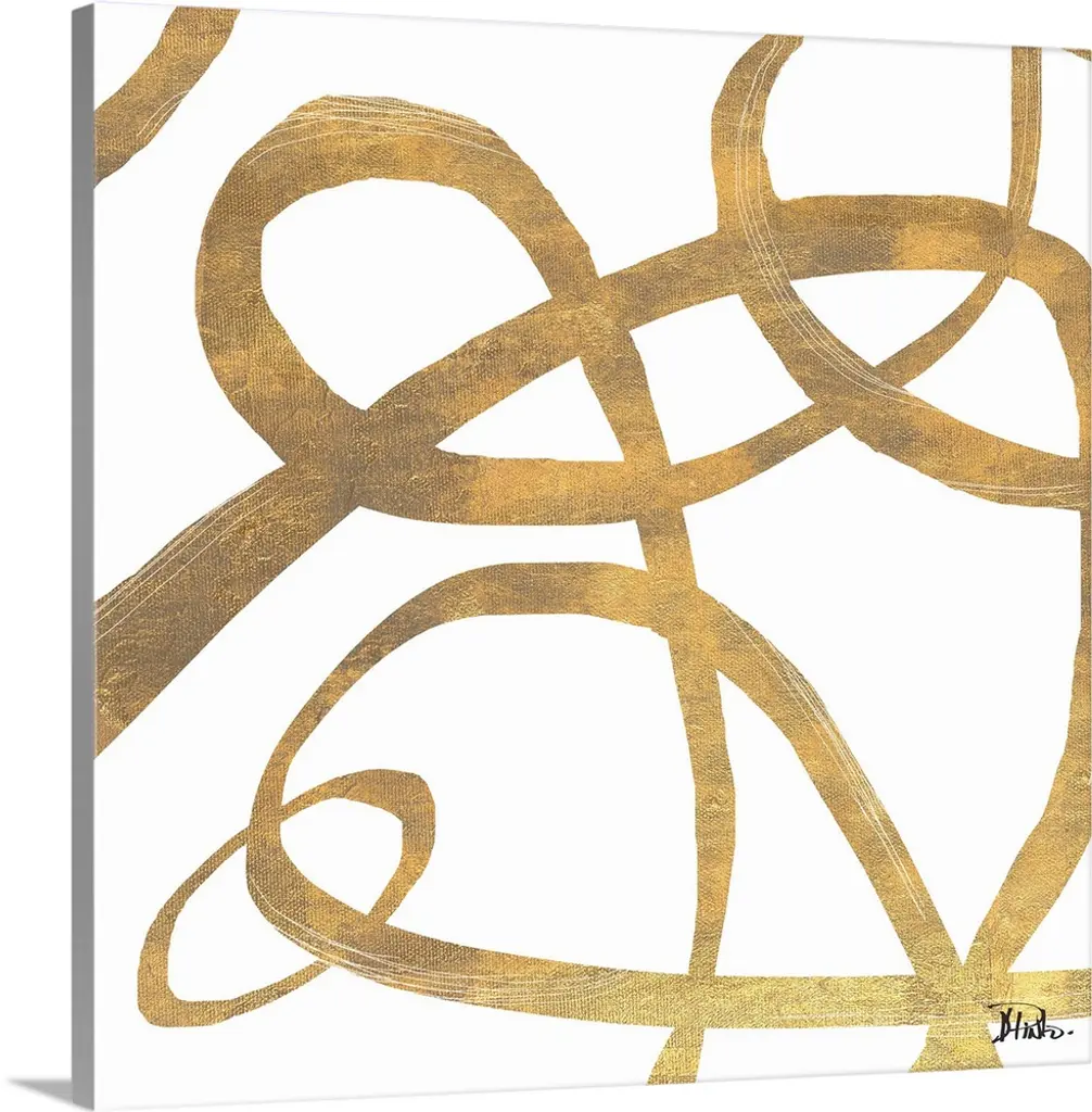 Contemporary abstract artwork of gold swirling lines in circling movements against a white background.