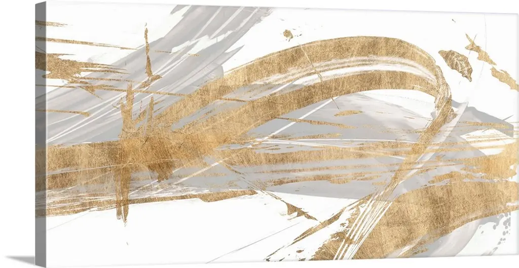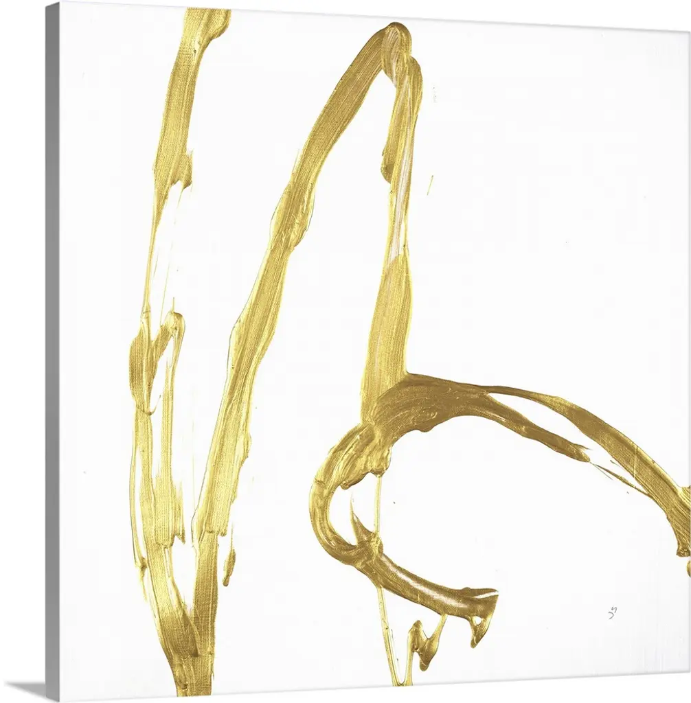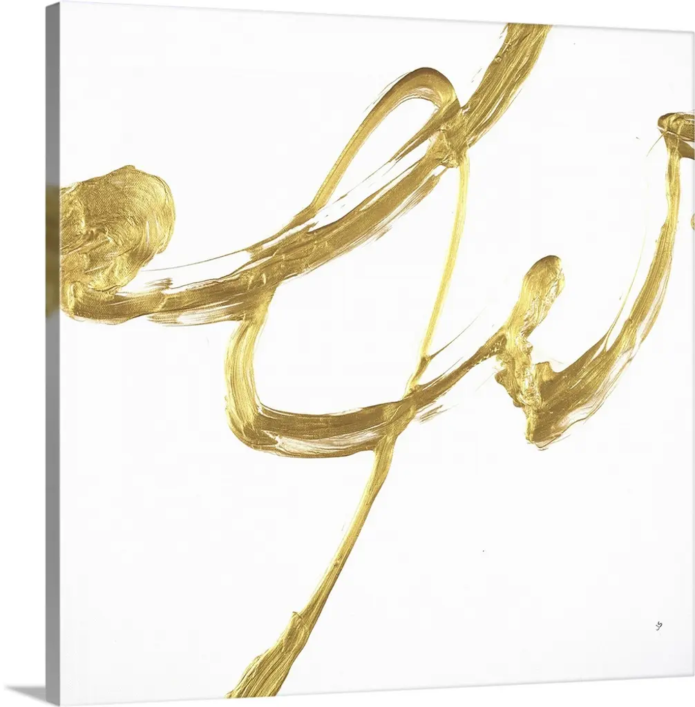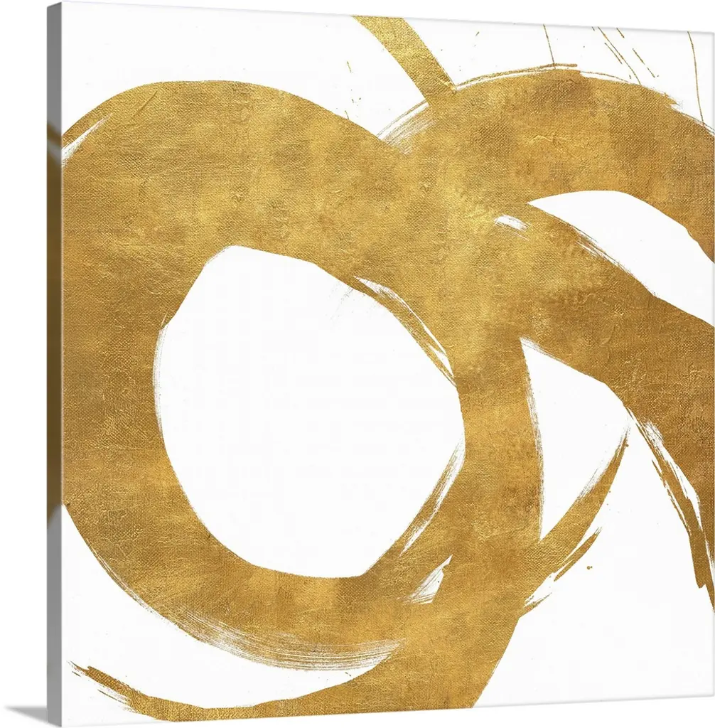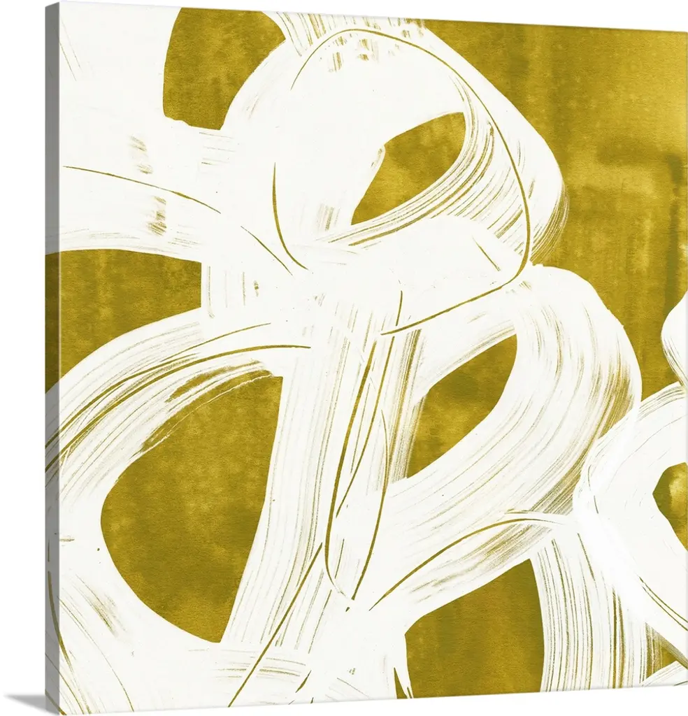 Contemporary abstract artwork of gold swirling lines in circling movements against a white background.