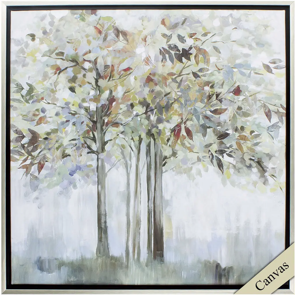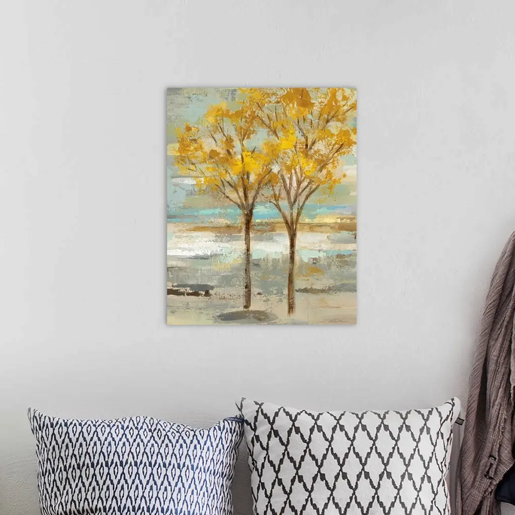 Abstract painting of two golden leafed trees on a colorful background made up of blue, green, tan, and gray short brushstrokes layered together.