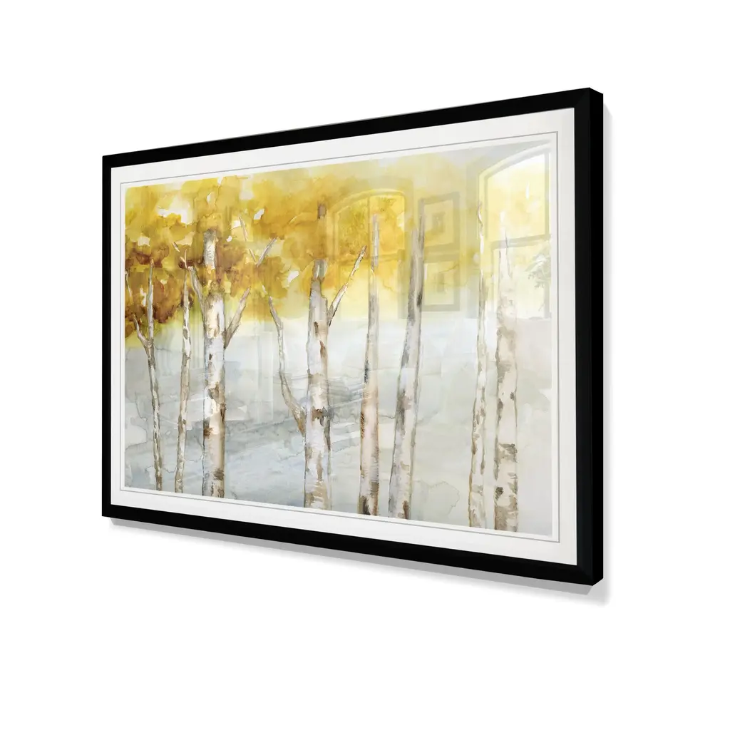 Golden Trees-Framed Giclee Print A premium framed giclee print Printed using the last archival inks. Each print is carefully printed and framed by hand. Each piece features a 2'' Beveled matt board, acrylic glass and comes ready to hand. 4 SIZES AVILABLE 18''X24''- Overall Size 22''x30''- Overall Size 26''x26''' - Overall Size 30''x42''' - Overall Size ** Overall size may vary slightly from piece to piece Each piece is made to order. Built to Last Each piece comes ready to hang Archival Ink 2'' Matt Board Assembled by hand in the America