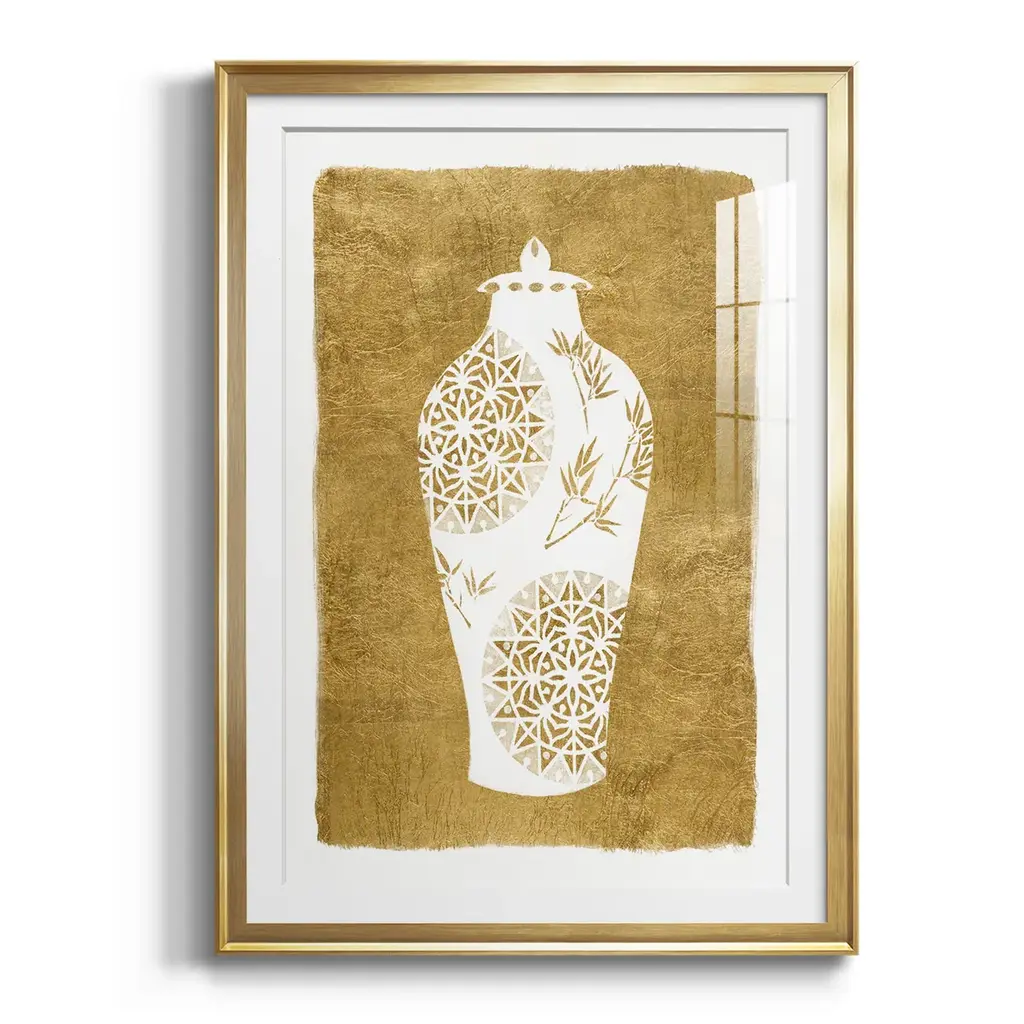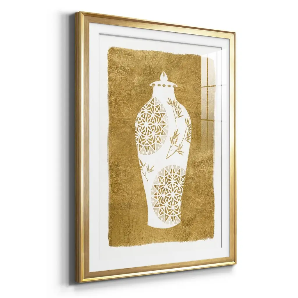 Golden Urn II Premium Framed Print - Ready to Hang A Premium Framed Print created to last. Framed in distressed wood and available in an array of sizes and colors Featuring a beveled a solid wood stretcher bar, each piece comes ready to hand 4 SIZES AVAILABLE 30.5''X42.5'' - Overall Size 26.5'X36.5'' - Overall Size 22.5''x30.5'' - Overall Size 18.5''x24.5'' - Overall Size Each piece is made to order. Each piece comes with hanging hardware. Made in the USA Ready to Hang Giclee Paper Print Acrylic Glass Beveled Matt Board