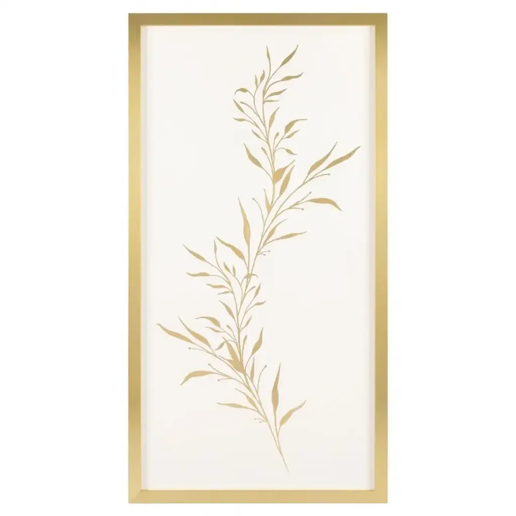 Golden Vines is a stunning in-house creation on watercolor paper that showcases a delicate floral motif in hand-applied gold leaf. The artwork is held within a gold gallery frame and may be displayed in both vertical and horizontal orientations.
