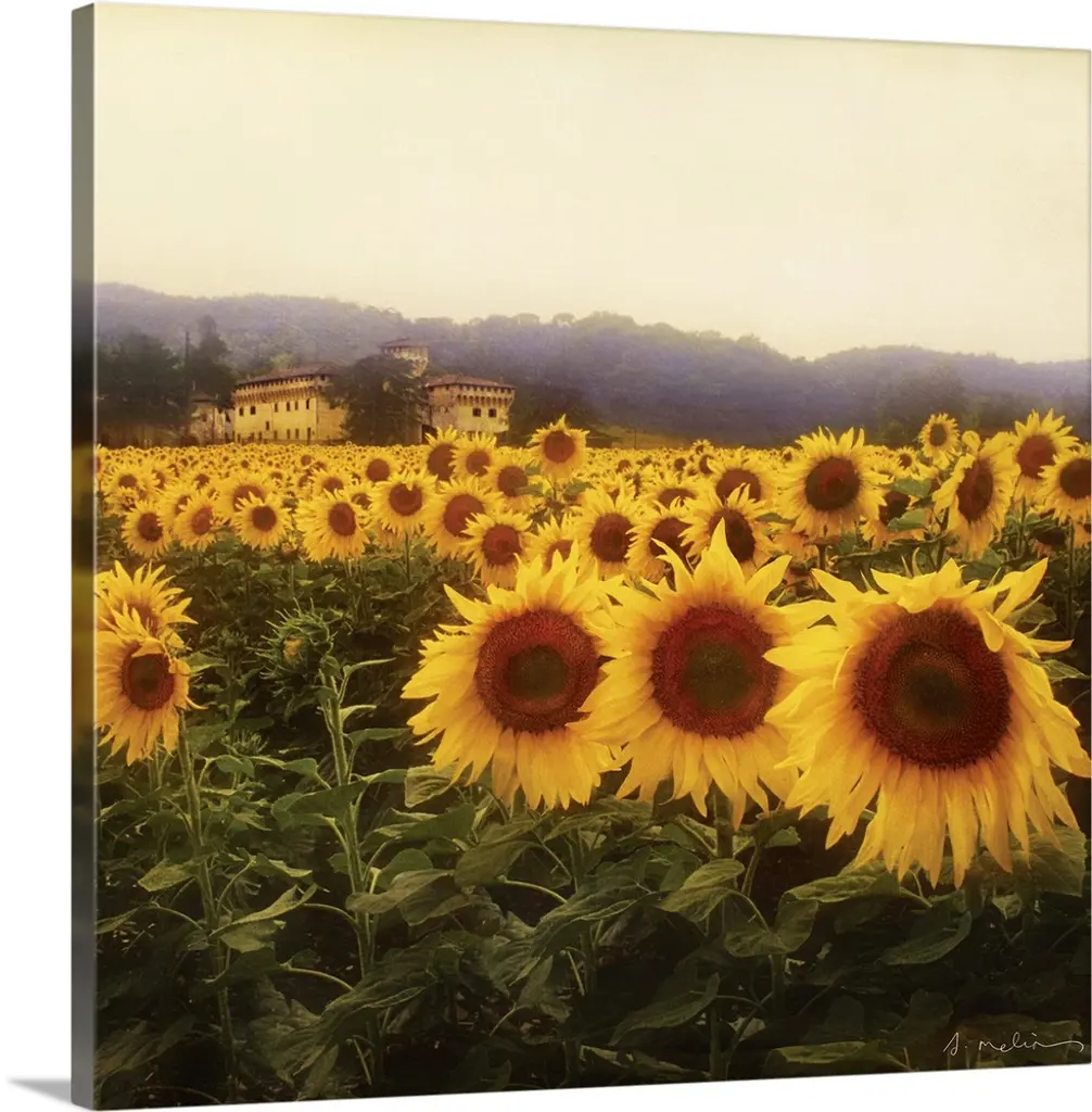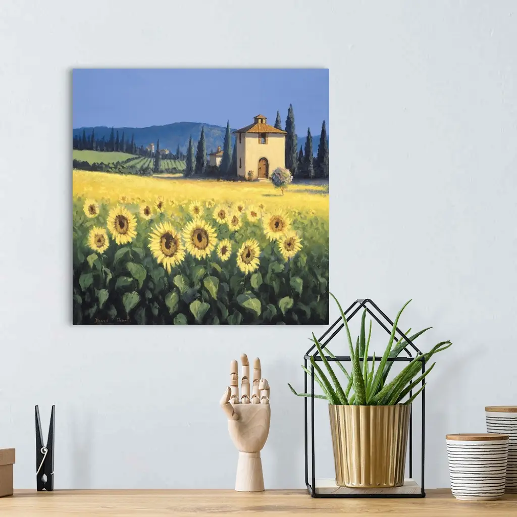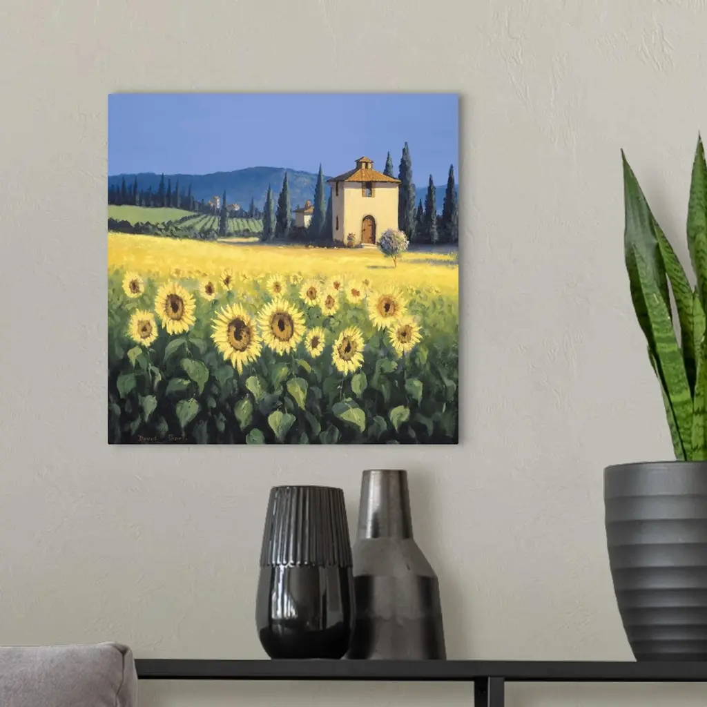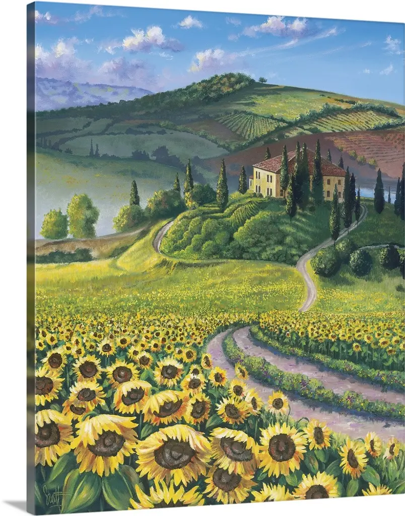 Painting of a field of sunflowers near a farm house in Tuscany.