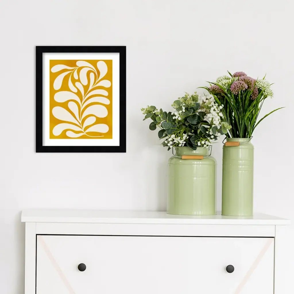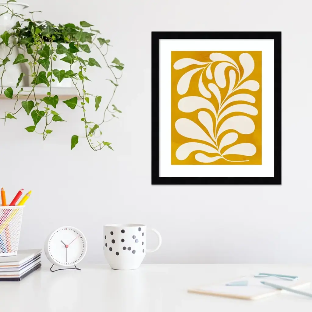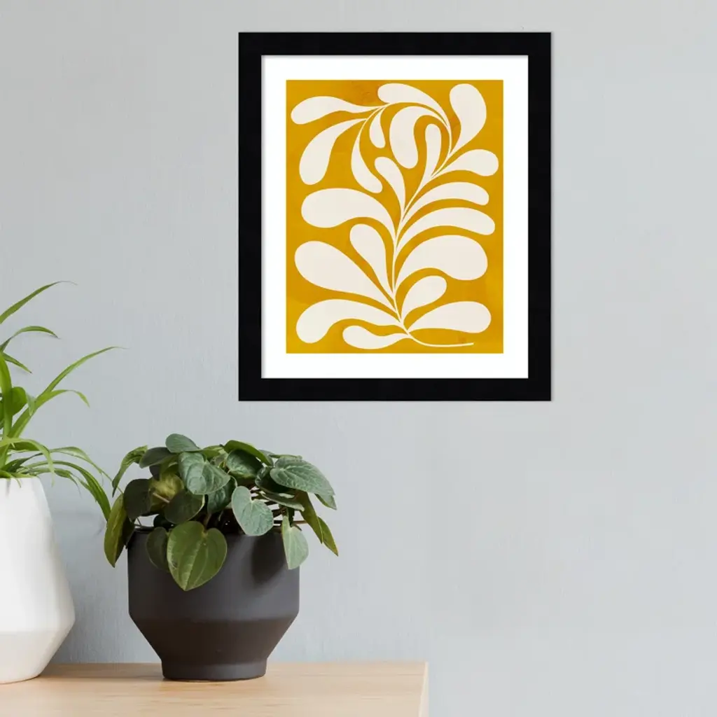 Elevate your space with this framed graphic art piece, boasting abstract botanicals and shapes. The closed corner frame complements the modernity of the artwork, making it a versatile addition to residential or non-residential settings.