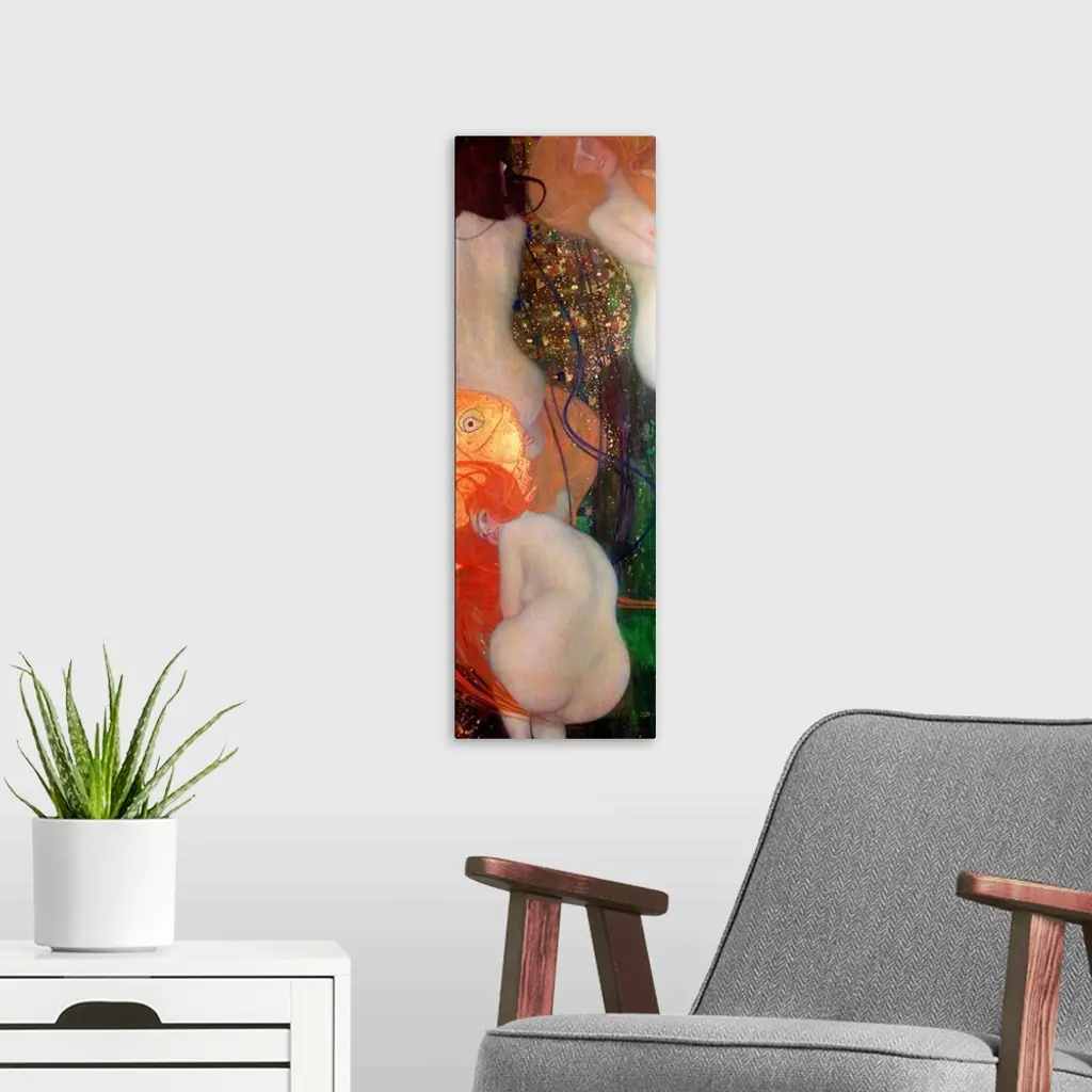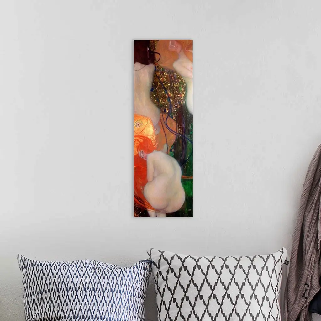 This vertical painting from very early 20th century shows nude female figures in provocative poses with their hair fluttering around them like fish fins.