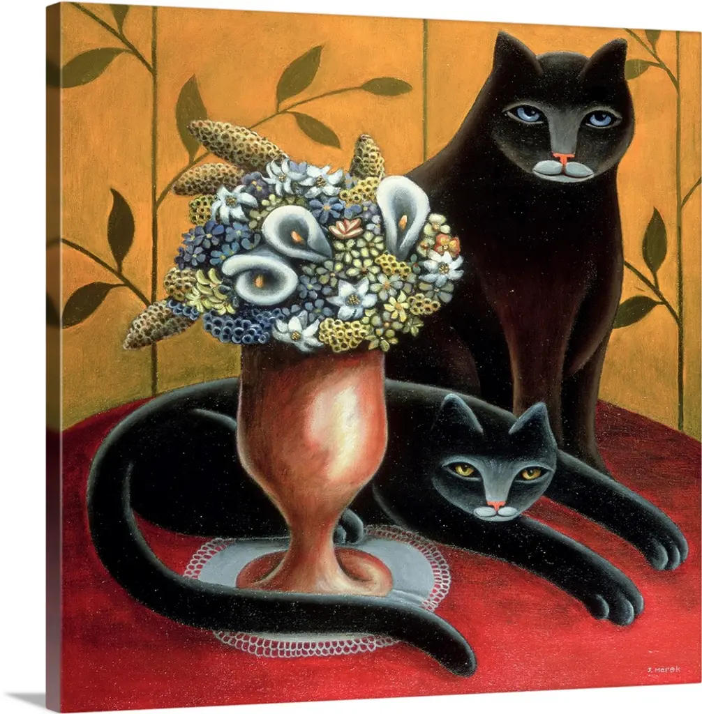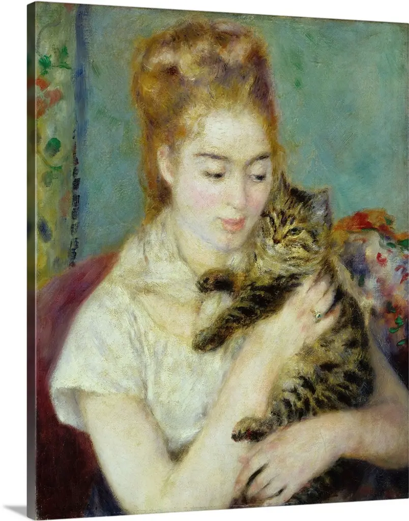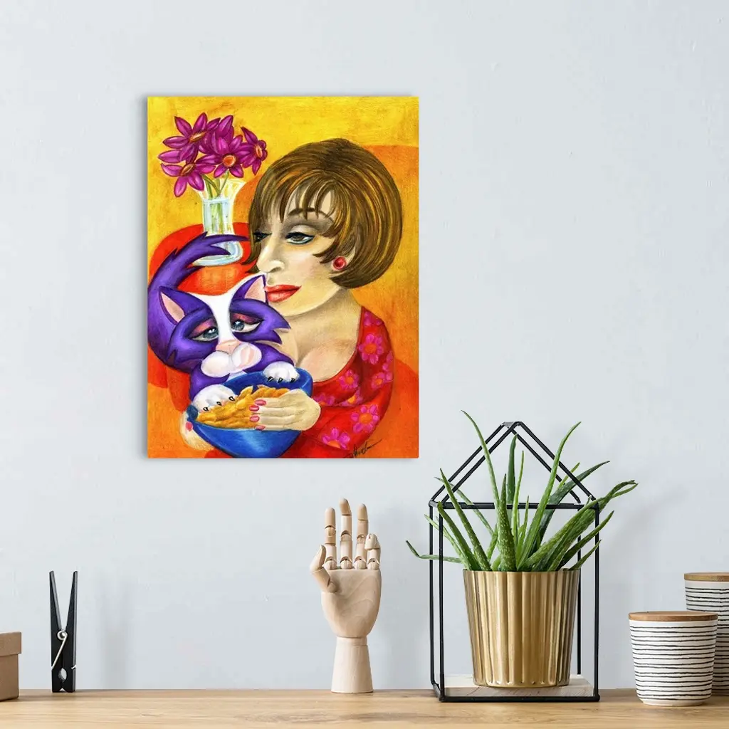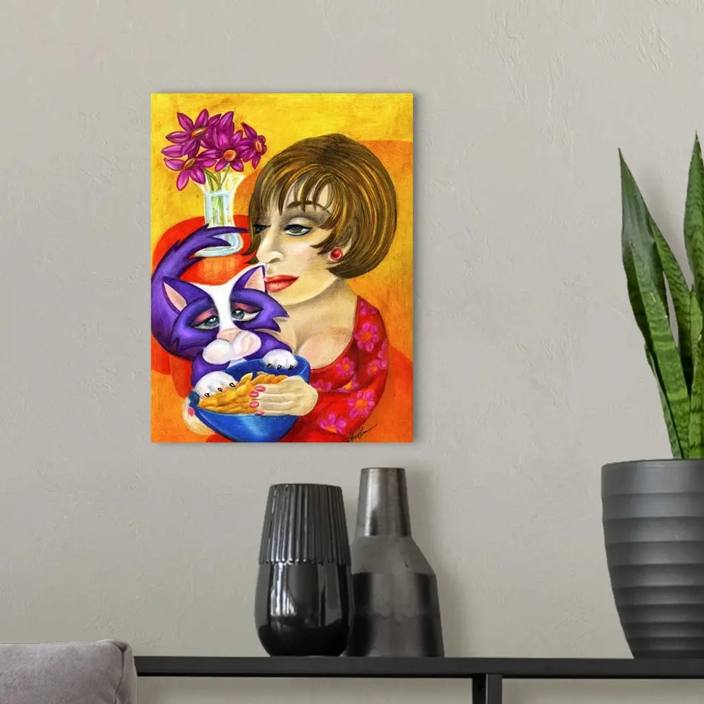 Contemporary artwork in the style of cubism of a woman with a cat in bold colors.
