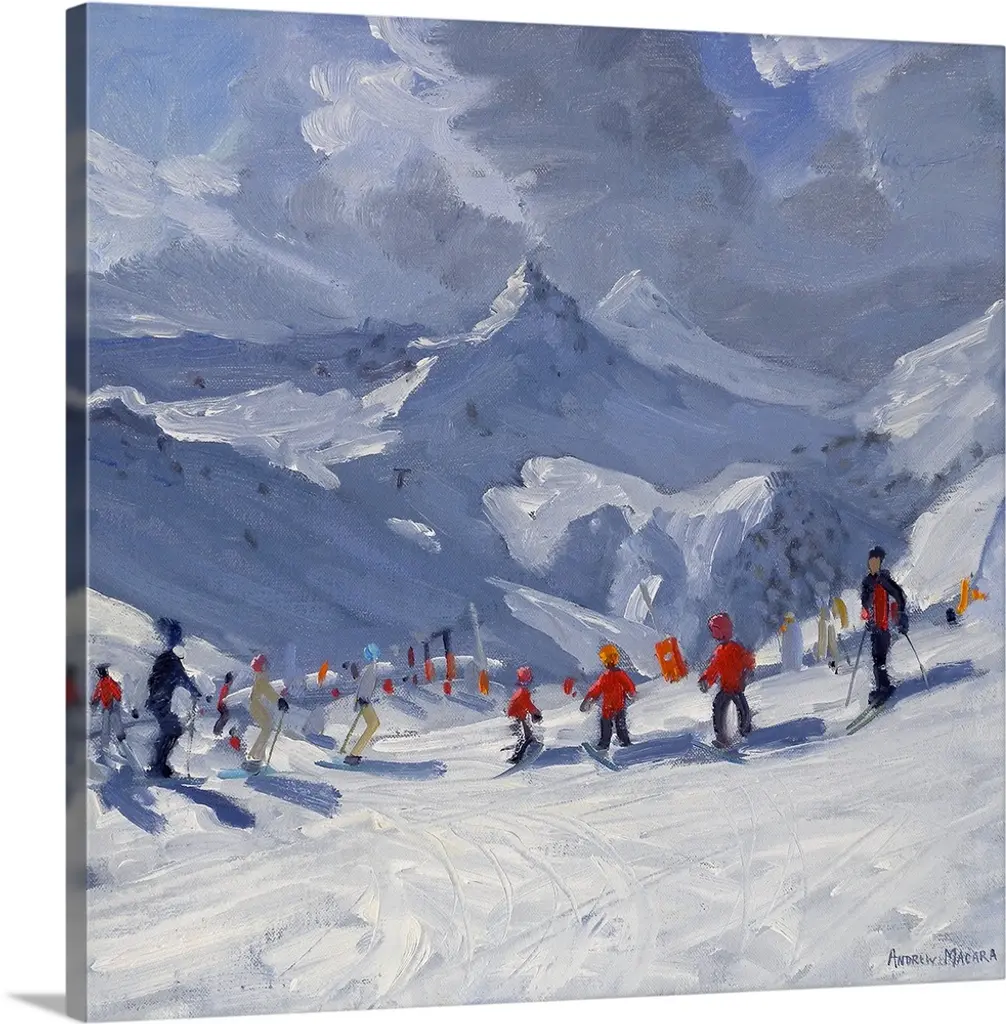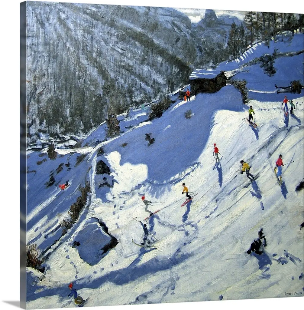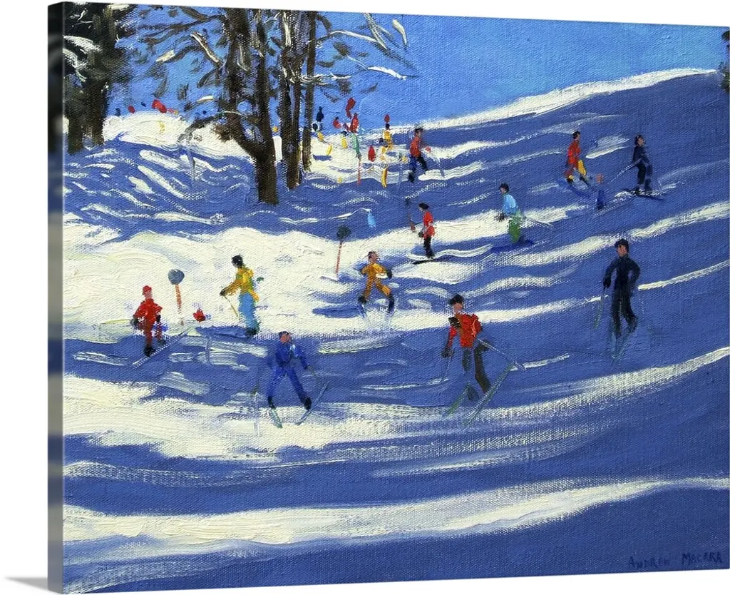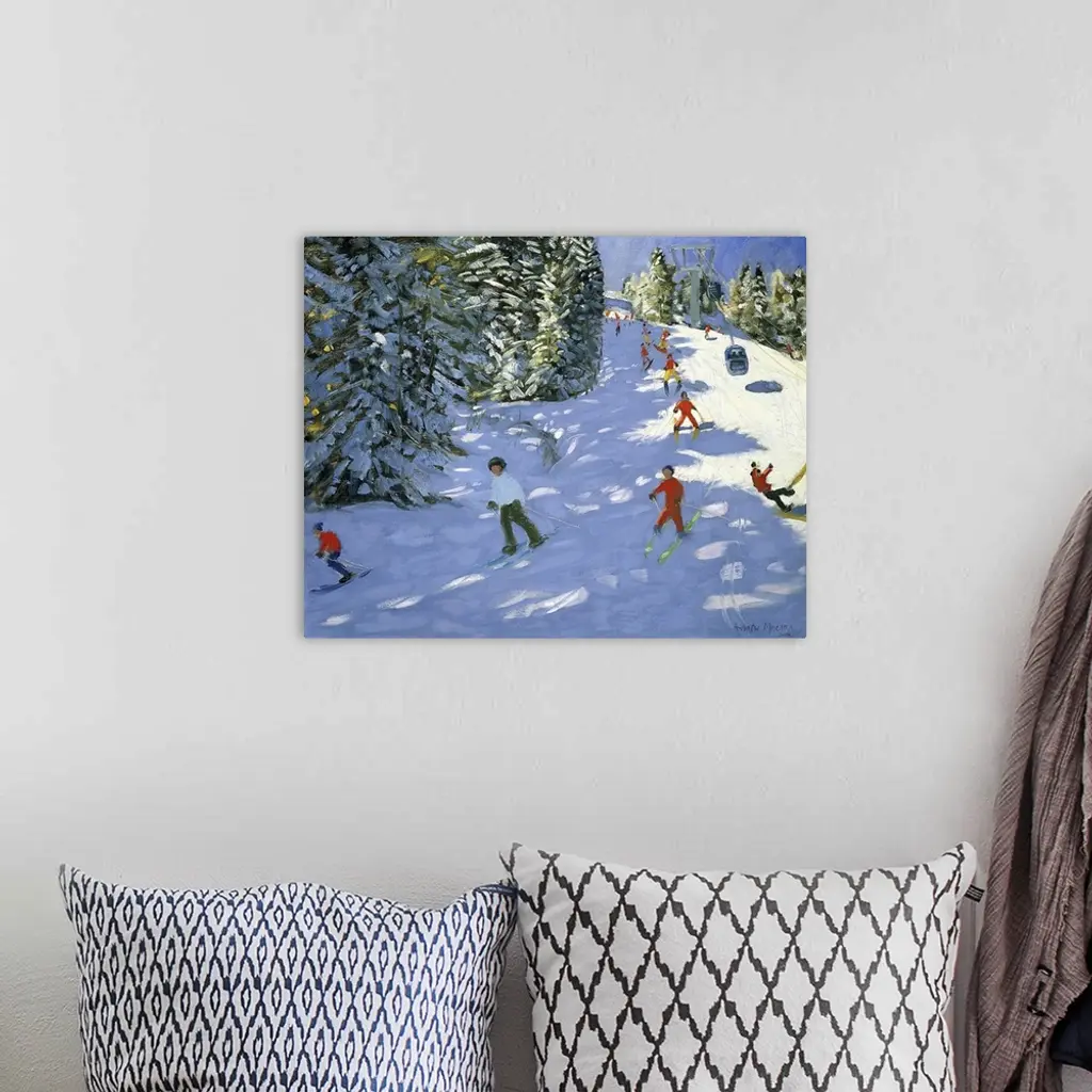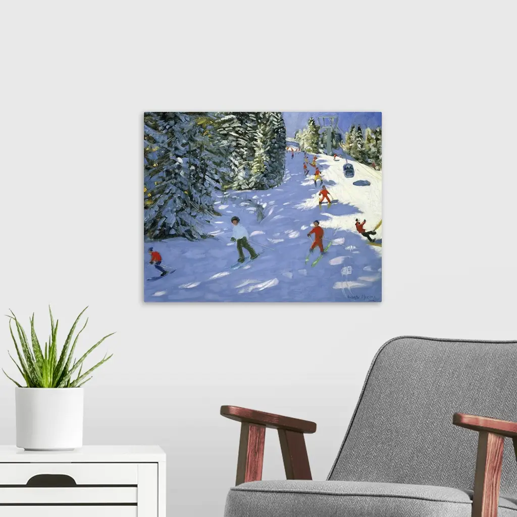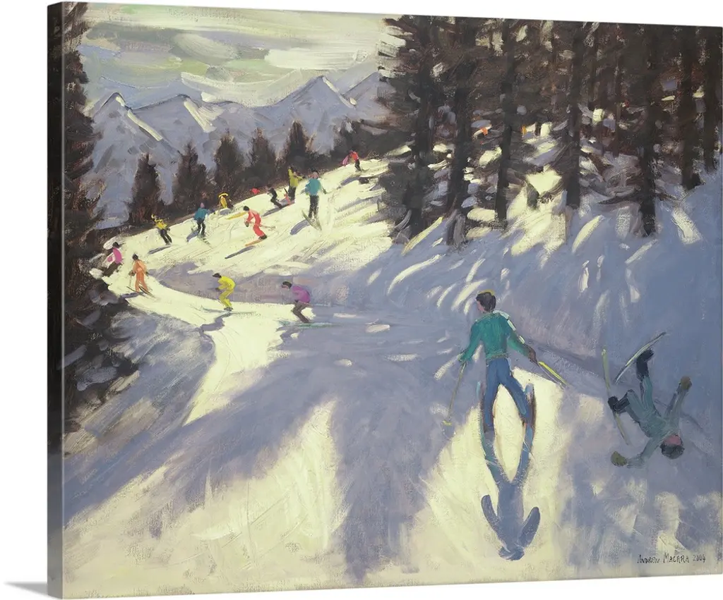 Painting of skiers on mountain slope surrounded my snow covered pine trees.