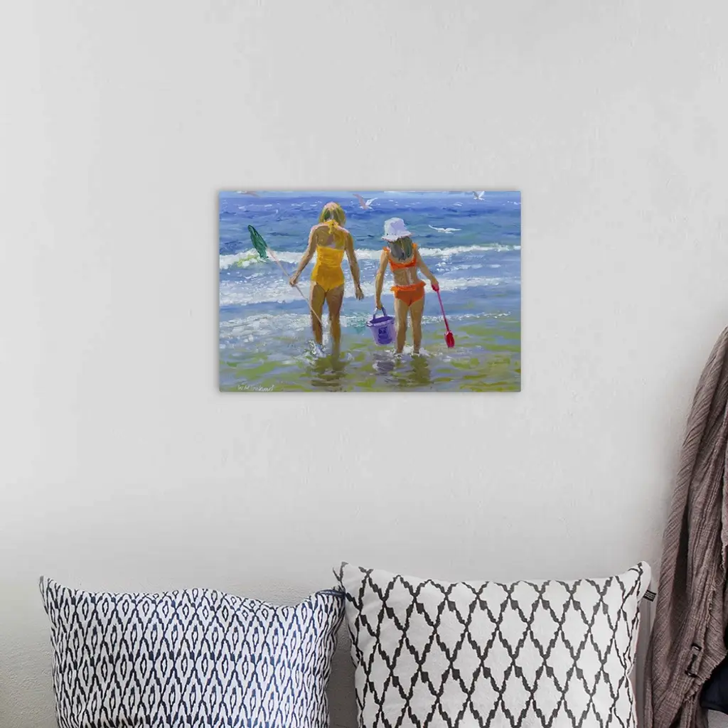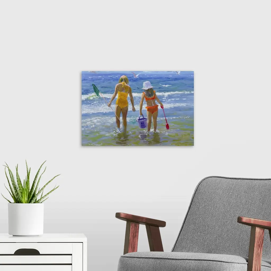 Oil painting of two young girls from behind, standing in the ocean holding a fishing net, bucket, and shovel.