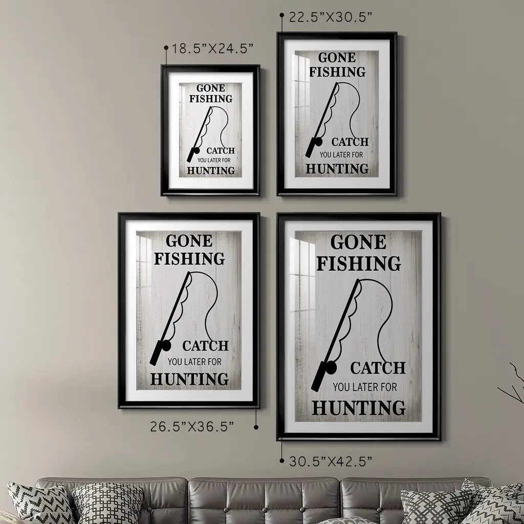 Gone Fishing Premium Framed Print - Ready to Hang A Premium Framed Print created to last. Framed in distressed wood and available in an array of sizes and colors Featuring a beveled a solid wood stretcher bar, each piece comes ready to hand 4 SIZES AVAILABLE 30.5''X42.5'' - Overall Size 26.5'X36.5'' - Overall Size 22.5''x30.5'' - Overall Size 18.5''x24.5'' - Overall Size Each piece is made to order. Each piece comes with hanging hardware. Made in the USA Ready to Hang Giclee Paper Print Acrylic Glass Beveled Matt Board
