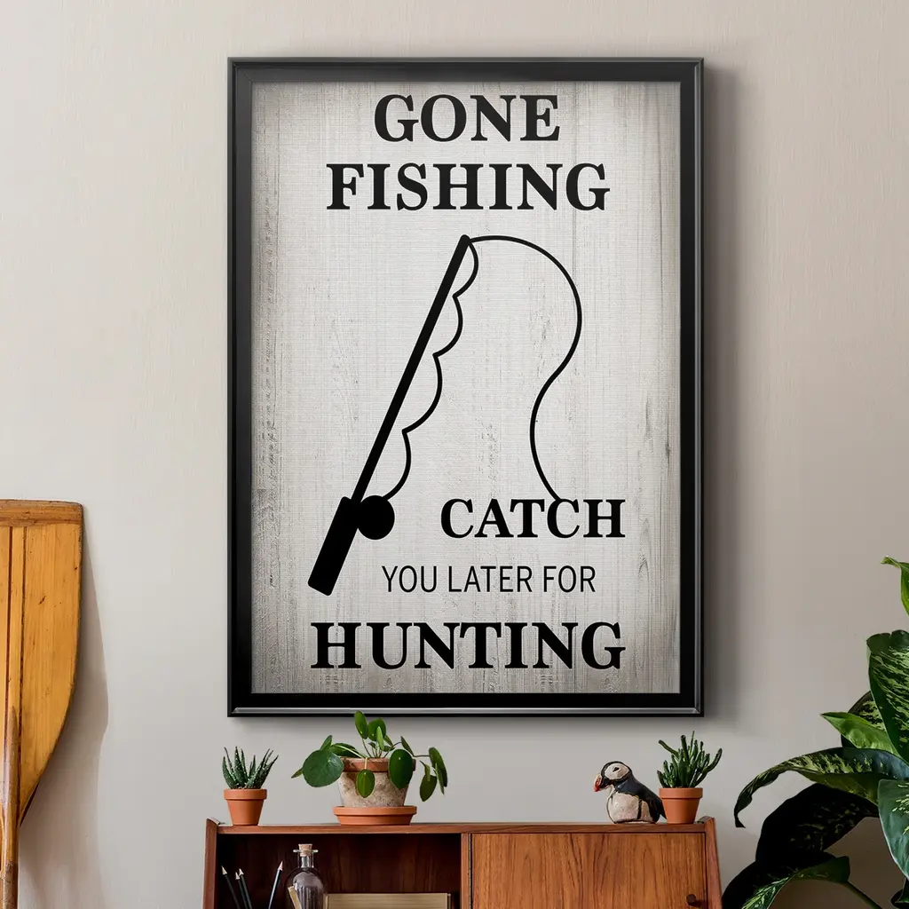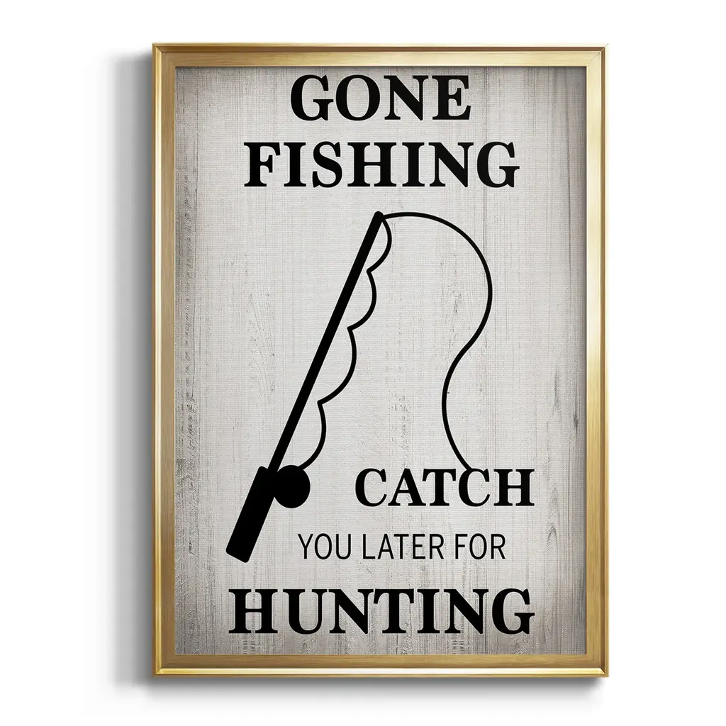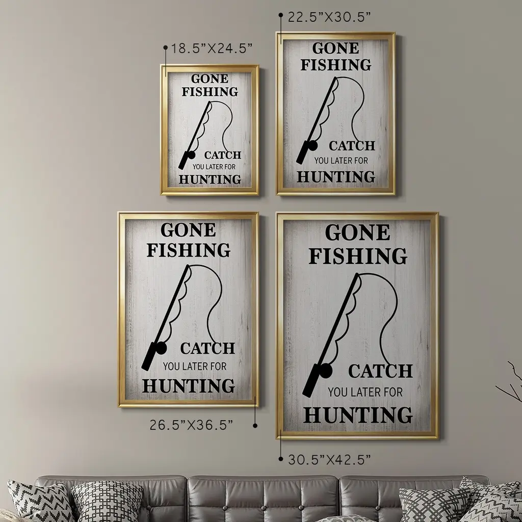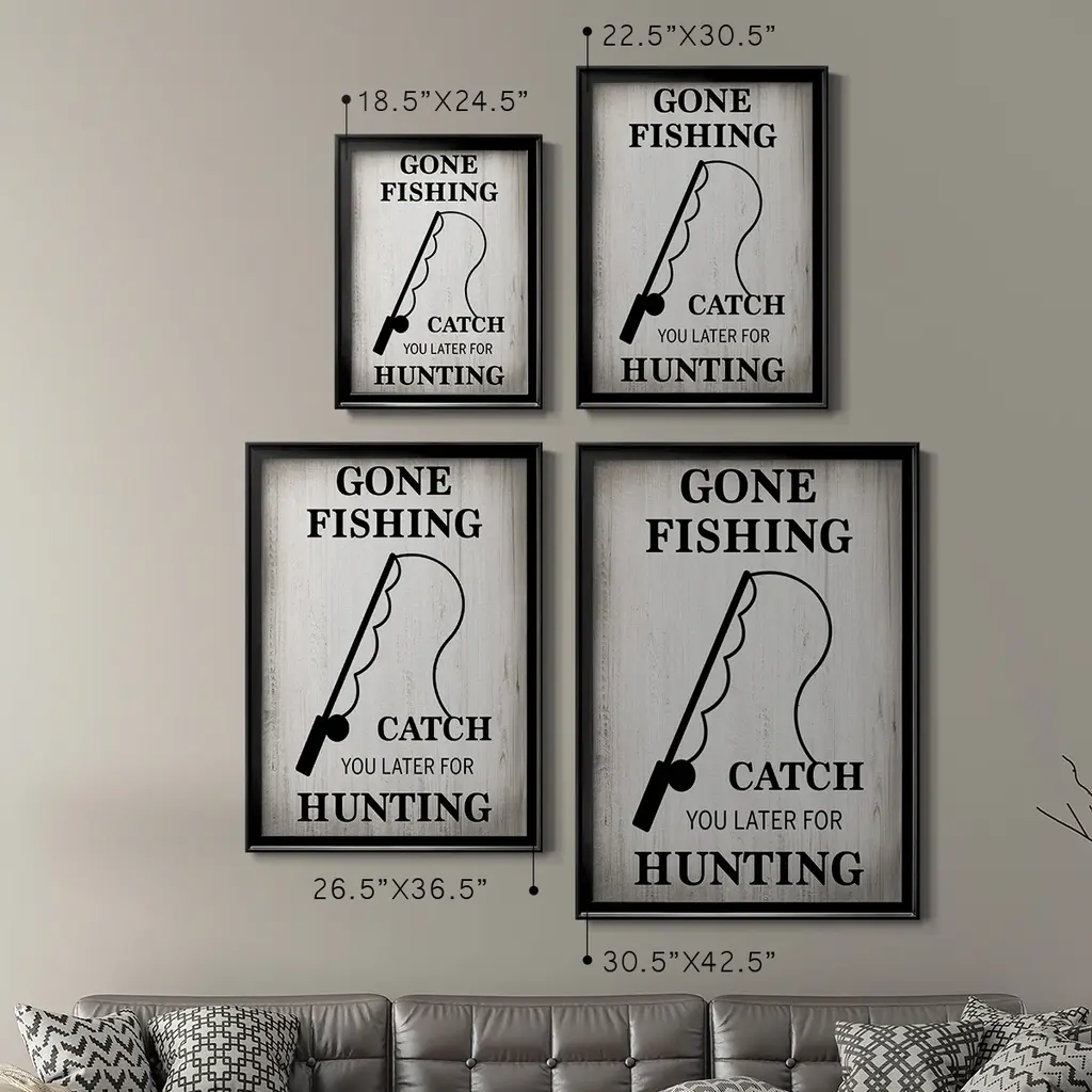 Gone Fishing Premium Framed Print - Ready to Hang A Premium Framed Print created to last. Framed in distressed wood and available in an array of sizes and colors Featuring a beveled a solid wood stretcher bar, each piece comes ready to hand 4 SIZES AVAILABLE 30.5''X42.5'' - Overall Size 26.5'X36.5'' - Overall Size 22.5''x30.5'' - Overall Size 18.5''x24.5'' - Overall Size Each piece is made to order. Each piece comes with hanging hardware. Made in the USA Ready to Hang