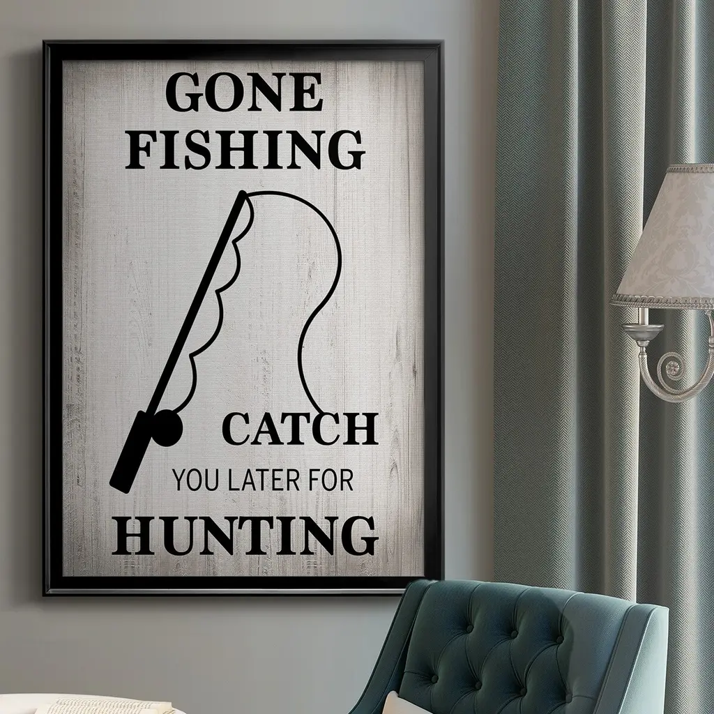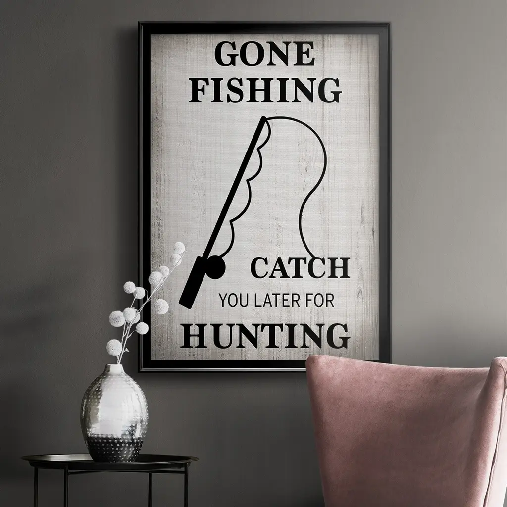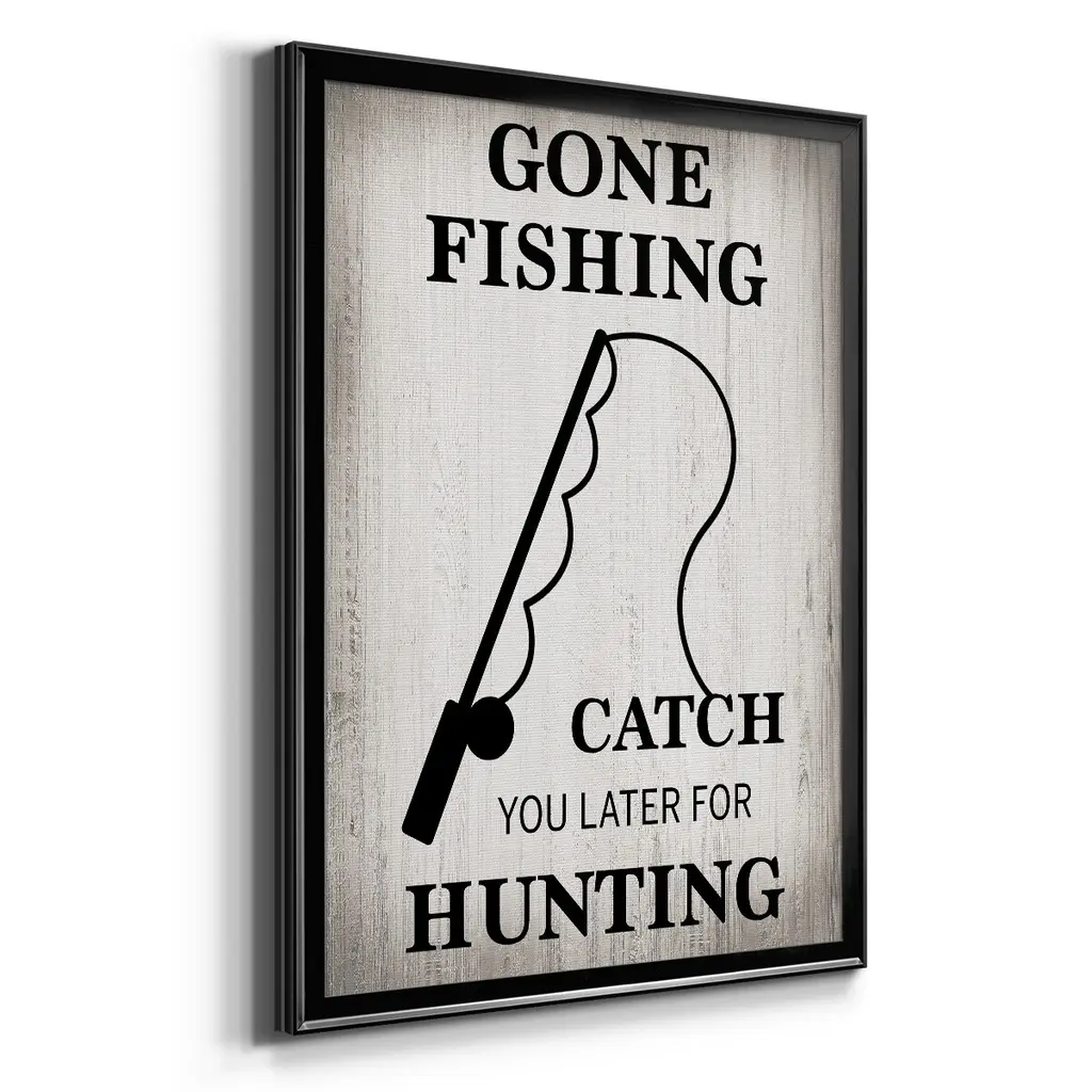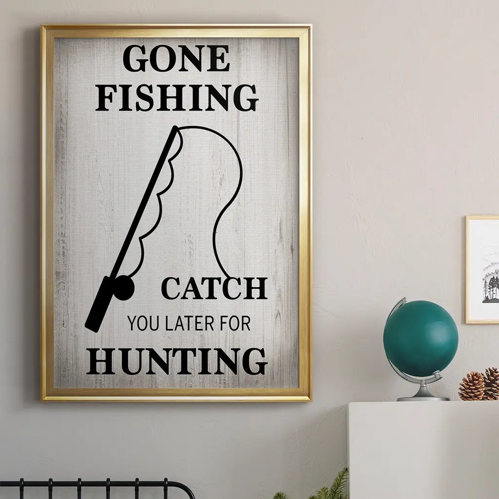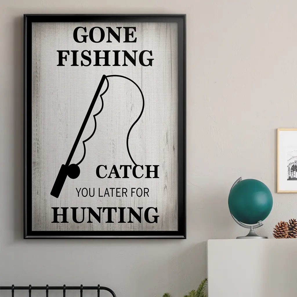 Gone Fishing Premium Framed Print - Ready to Hang A Premium Framed Print created to last. Framed in distressed wood and available in an array of sizes and colors Featuring a beveled a solid wood stretcher bar, each piece comes ready to hand 4 SIZES AVAILABLE 30.5''X42.5'' - Overall Size 26.5'X36.5'' - Overall Size 22.5''x30.5'' - Overall Size 18.5''x24.5'' - Overall Size Each piece is made to order. Each piece comes with hanging hardware. Made in the USA Ready to Hang