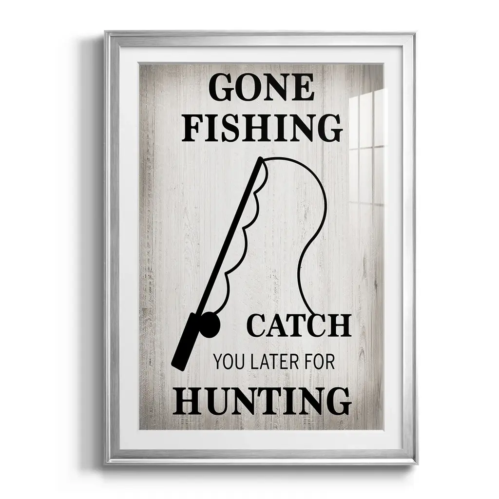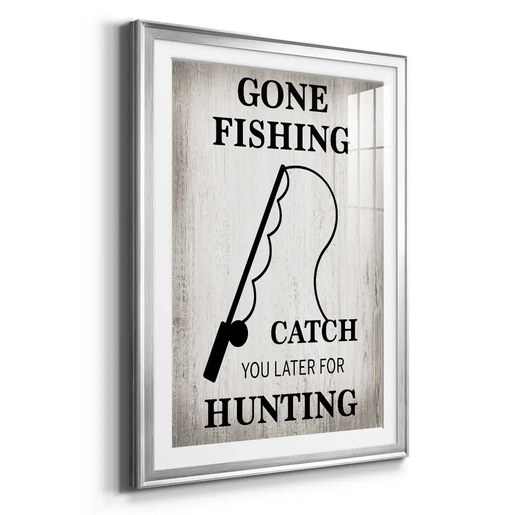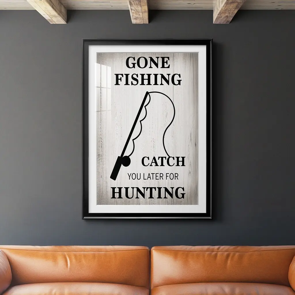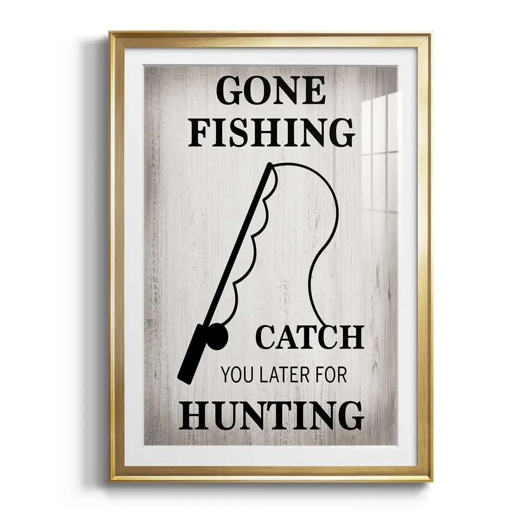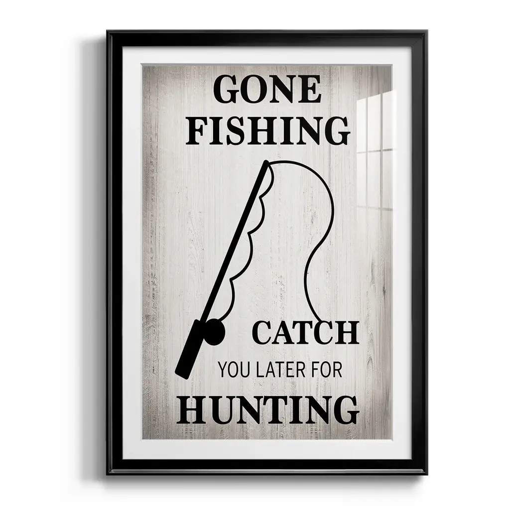 Gone Fishing Premium Framed Print - Ready to Hang A Premium Framed Print created to last. Framed in distressed wood and available in an array of sizes and colors Featuring a beveled a solid wood stretcher bar, each piece comes ready to hand 4 SIZES AVAILABLE 30.5''X42.5'' - Overall Size 26.5'X36.5'' - Overall Size 22.5''x30.5'' - Overall Size 18.5''x24.5'' - Overall Size Each piece is made to order. Each piece comes with hanging hardware. Made in the USA Ready to Hang Giclee Paper Print Acrylic Glass Beveled Matt Board