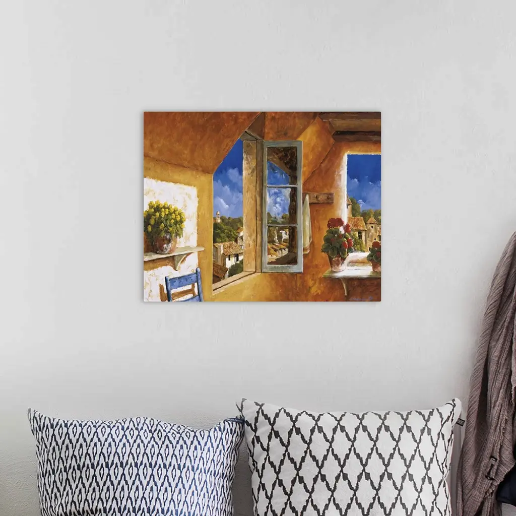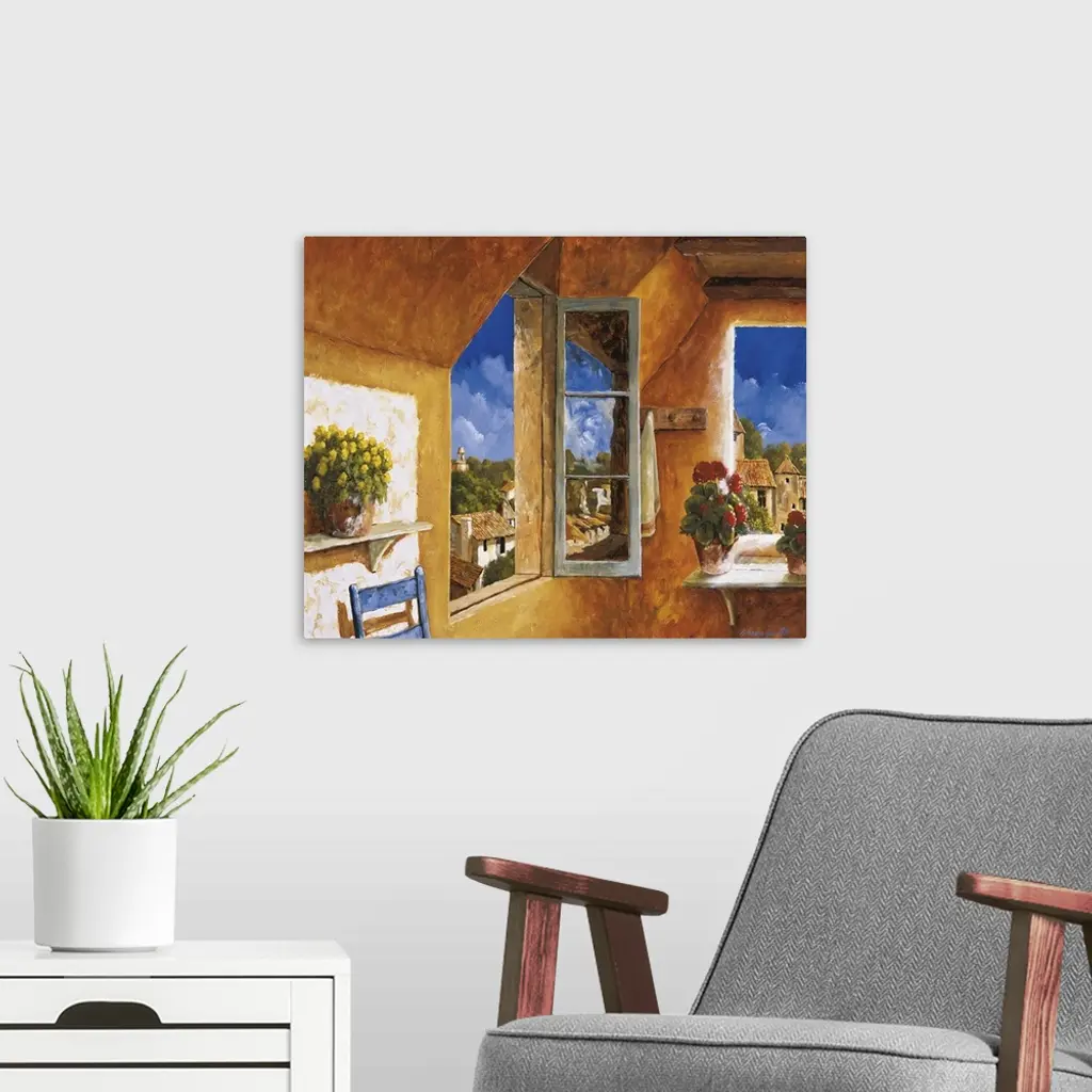 Artwork of an open window in a home in a European village.