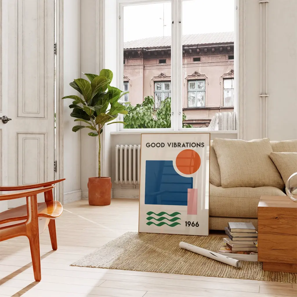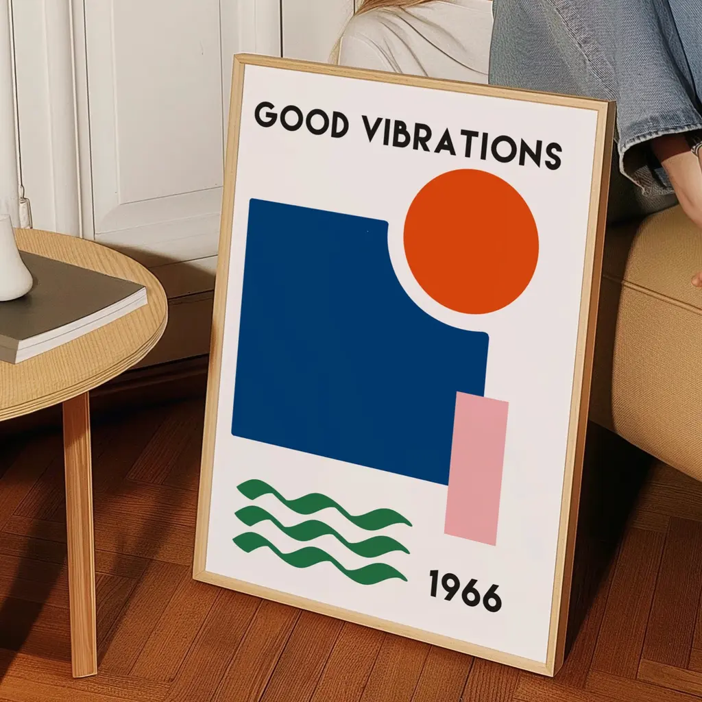 Spread positive energy with our Good Vibrations abstract art.This playful print was inspired by the iconic 66' Beach Boys song "Good Vibrations". Influenced by abstract artist Matisse, using pops of colour and retro style clean typography this print can add a touch of modern 60s to any space. Printed with bold pops of colour on an off white base designed to replicate 60's/70's design - the perfect side kick to your framed vinyl covers and plants.Giclée printed on Munken pure smooth cream paper which is certified by the Rainforest Alliance Program for FSC® Standards.