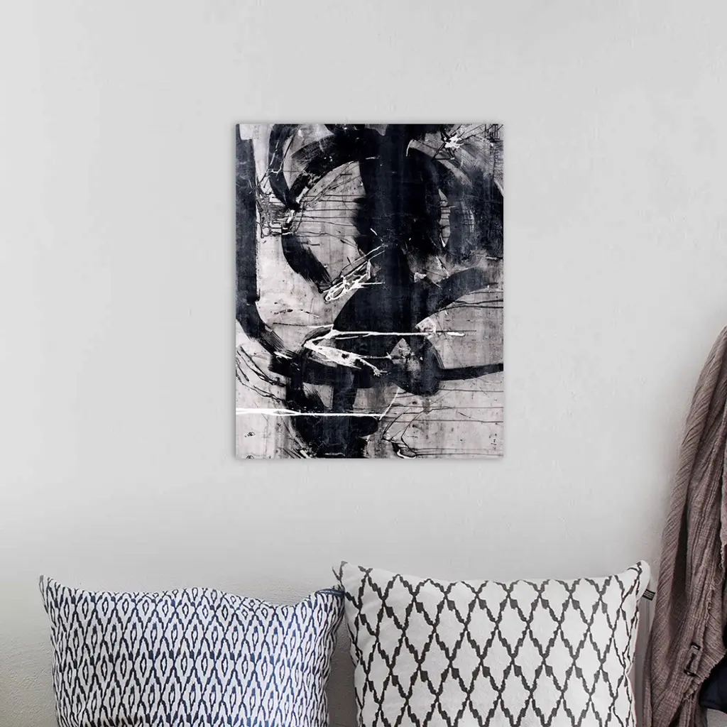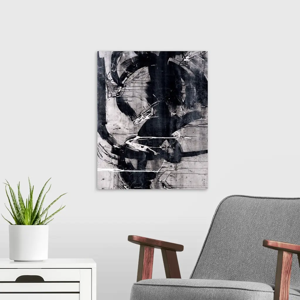 Abstract painting that has black, white, and gray hues with thick, bold, black curvy lines dominating on top with thin white lines scattered throughout.