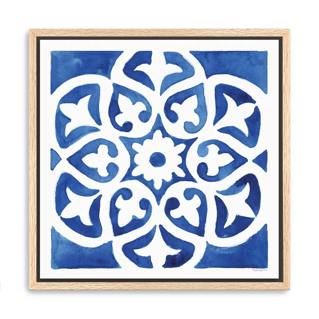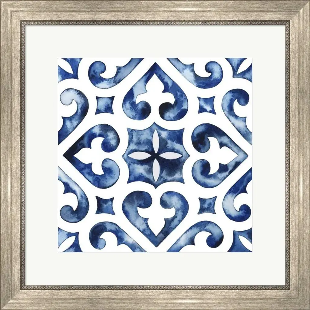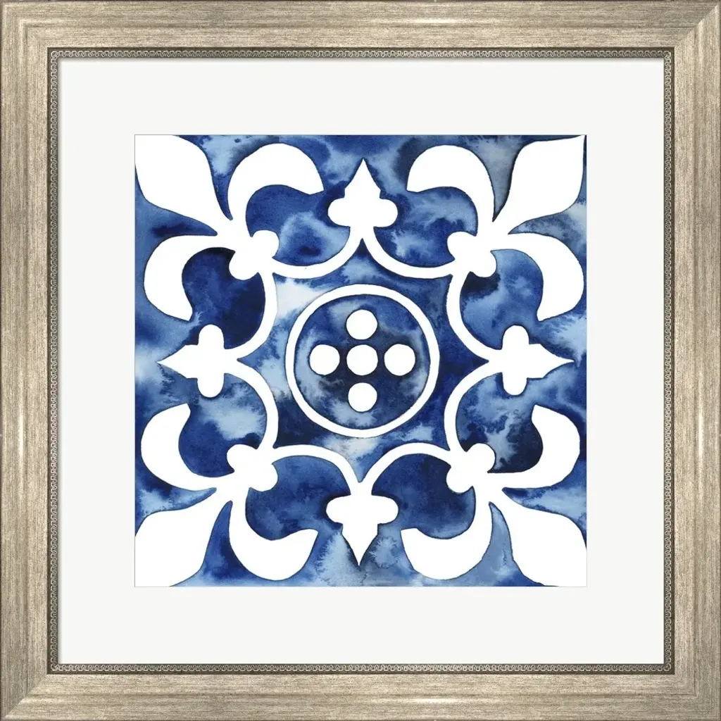 Cobalt Tile II by Grace Popp is a high quality piece of framed artwork. The finished size of this piece is 22" X 22". It has a Classic Champagne Silver with Ornate Inner Edge frame, is single matted and finished with high quality Acrylic Plexiglass.