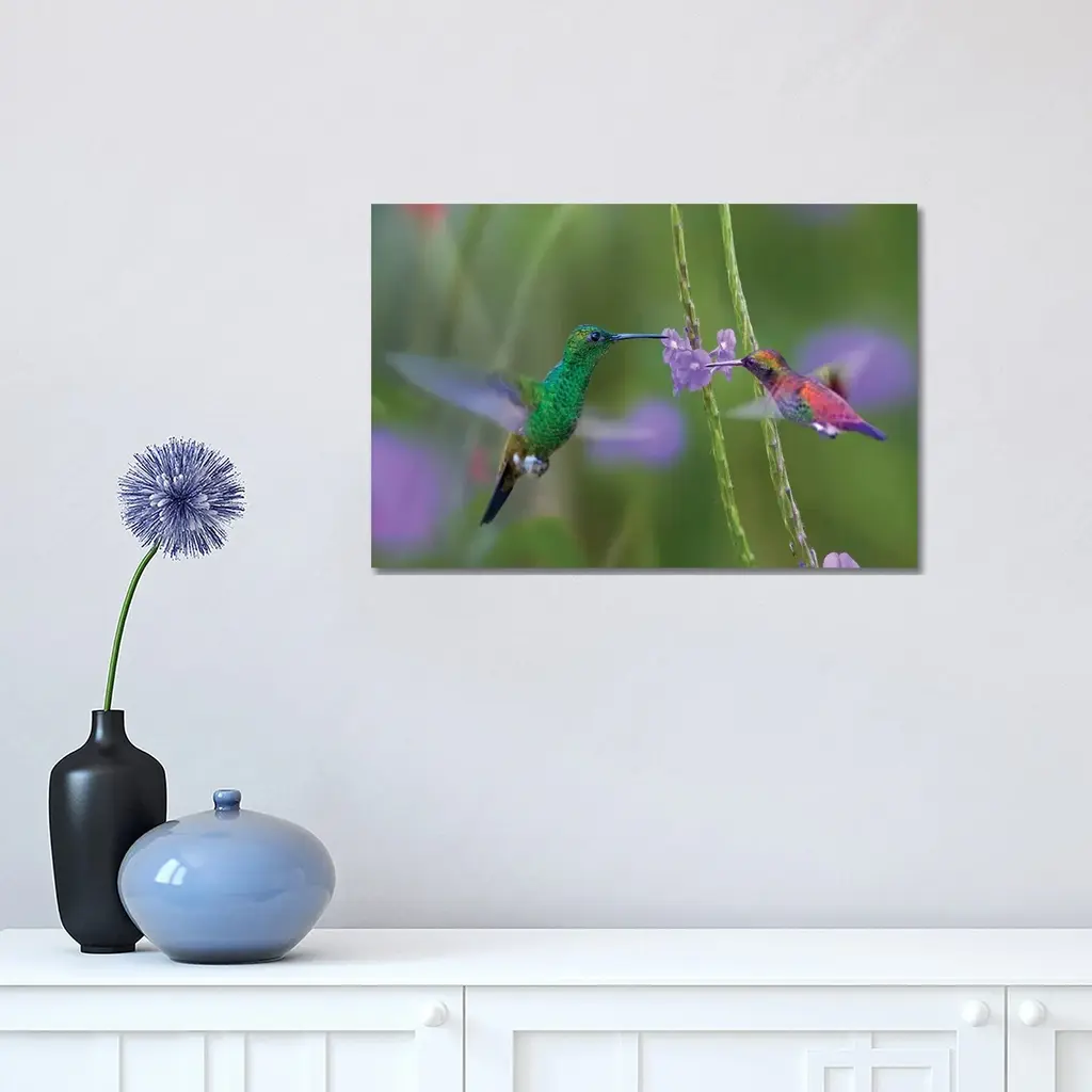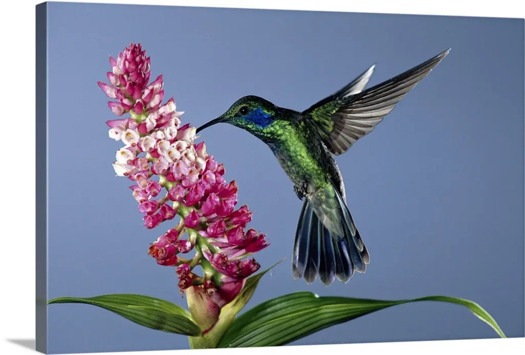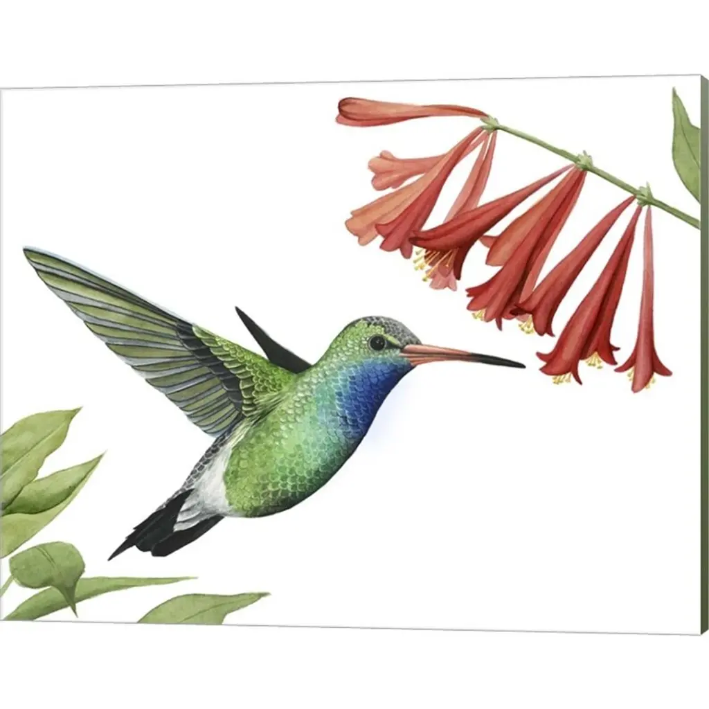 Hummingbird & Flower II by Grace Popp is a high quality piece of canvas artwork. The finished size of this piece is 20" X 16", and it has a depth 0.75" with sagegreen painted sides. There is a UV protective coating over the entire image, and it is ready to hang on your wall with no hardware required.
