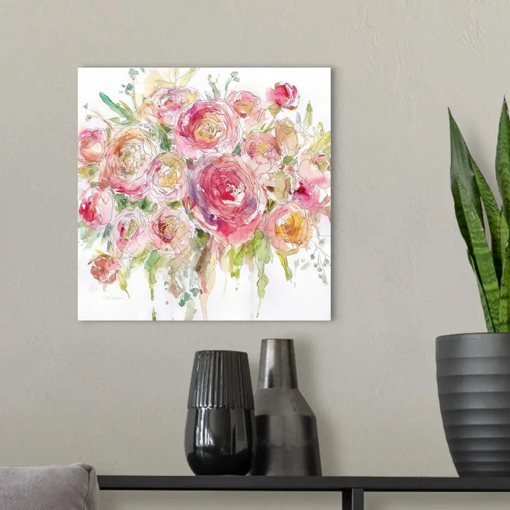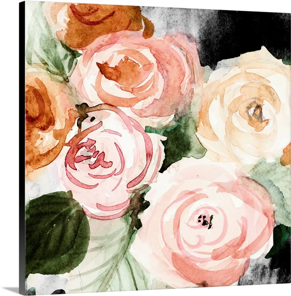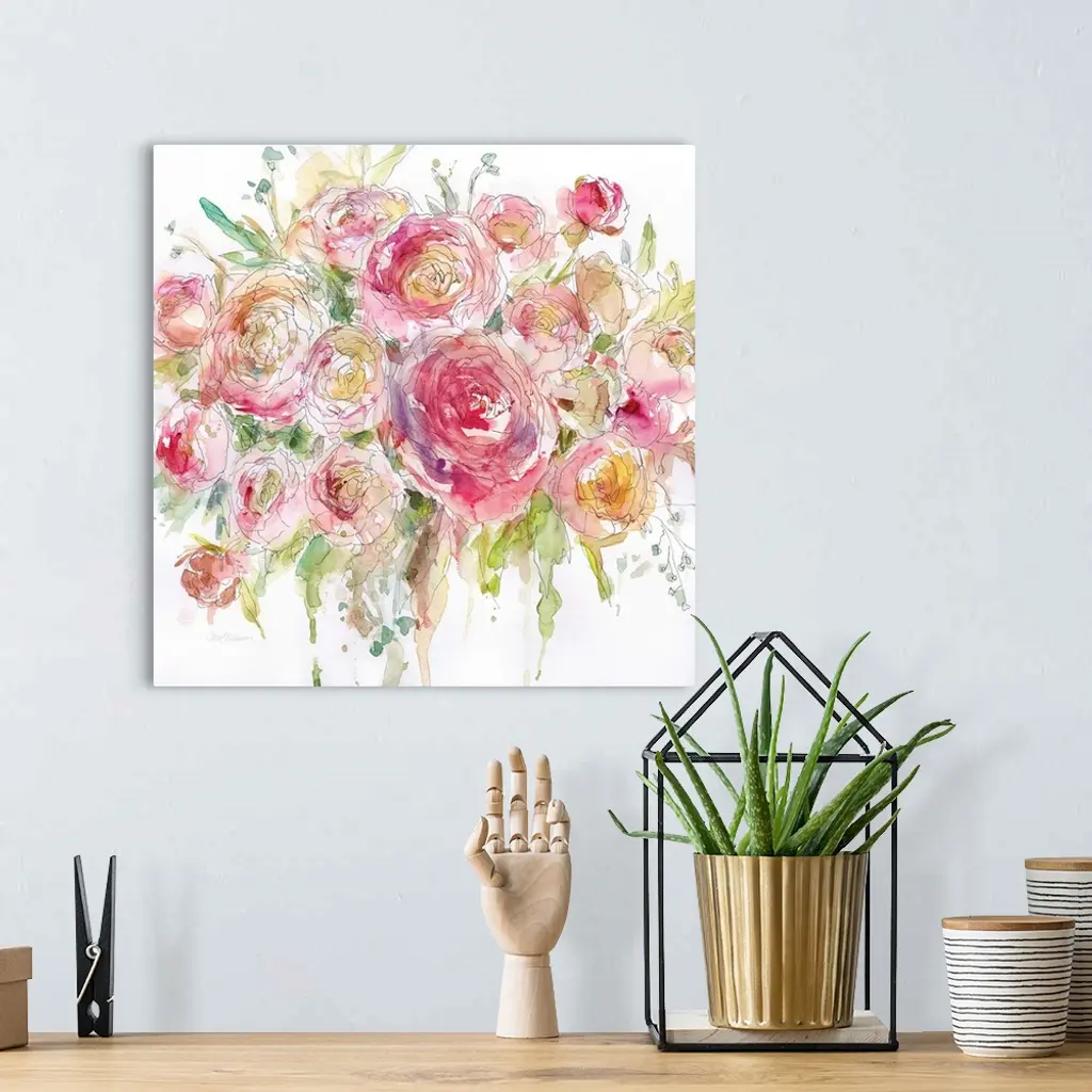 Square watercolor painting of an arranged bouquet of roses.