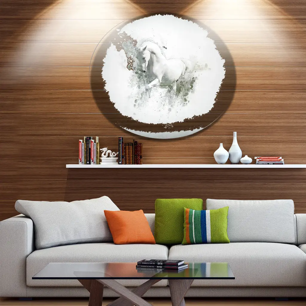 Bring Contemporary Abstraction to your home with this large Circle Metal wall art. This Graceful White Horse Metal Artwork makes it the focal point of any room or office. - White Gloss Coating ensures colors are extra vibrant with light reflection.- Aluminum grade Sheet Metal with 1 inch mounting frame on the back giving the illusion that the artwork is floating on the wall..- Mounting Brackets are included along with instructions.- High Quality Digital images are created directly into a glossy aluminum panel producing a stunning and captivating print into the glossy finish of the metal.- Water, Fire and Scratch resistant HD Aluminum panels.- Looks better than any photo paper and guaranteed to last at least 20 years- Easy to clean with a microfiber cloth. Colors are far superior to regular Canvas Art. - Easy to Hang