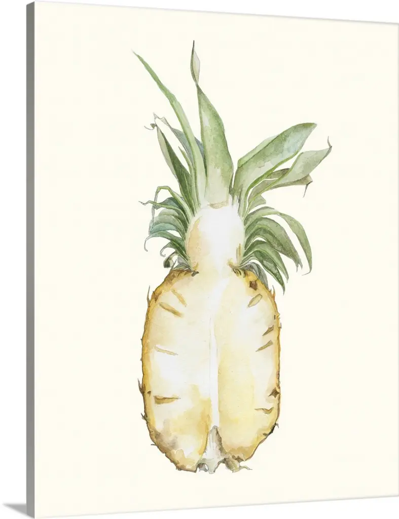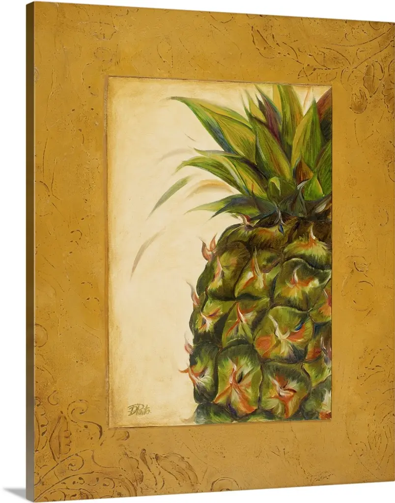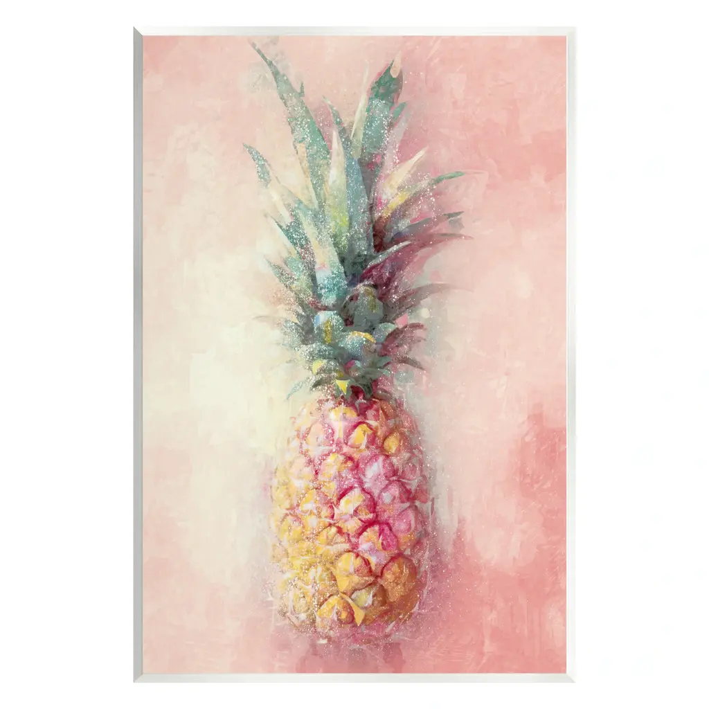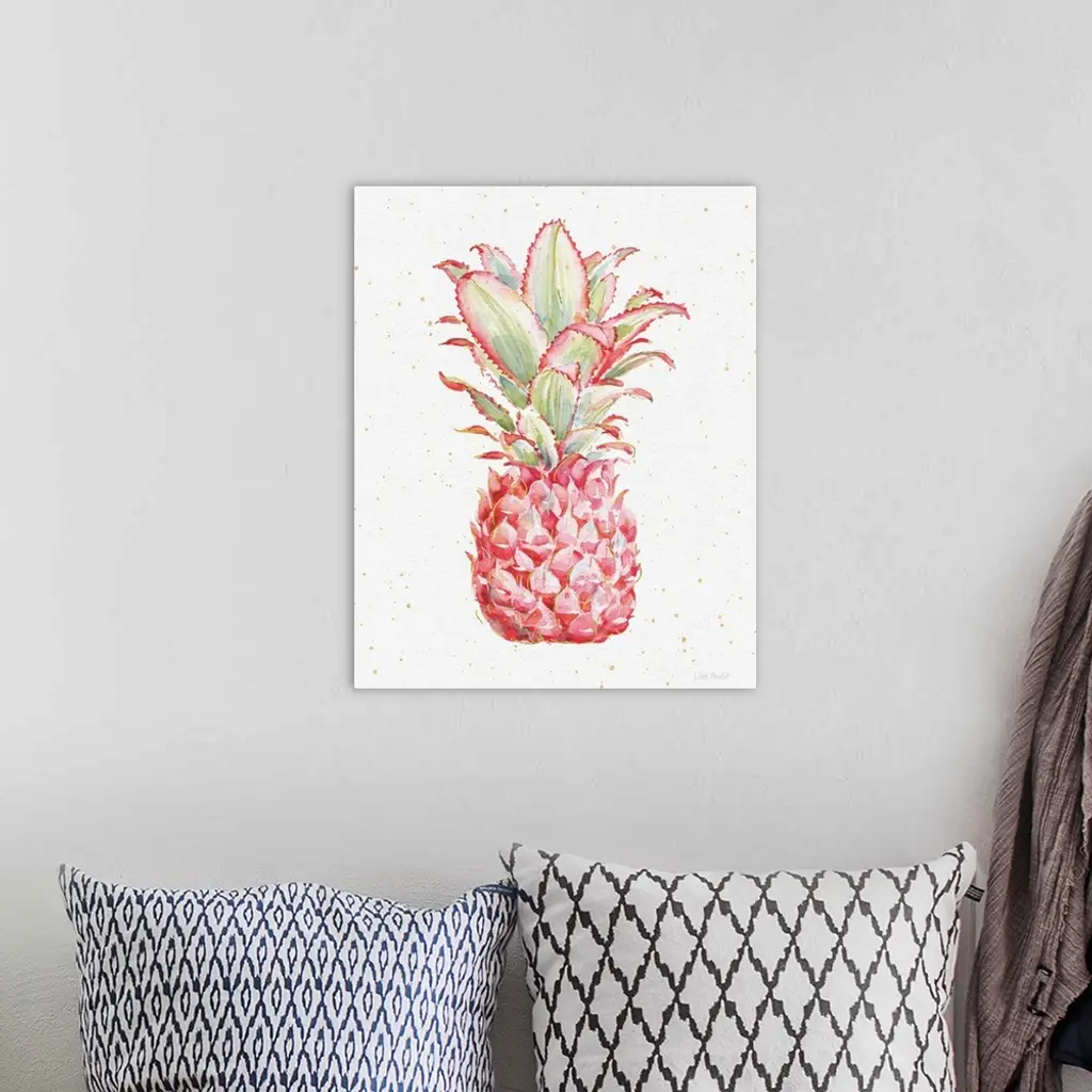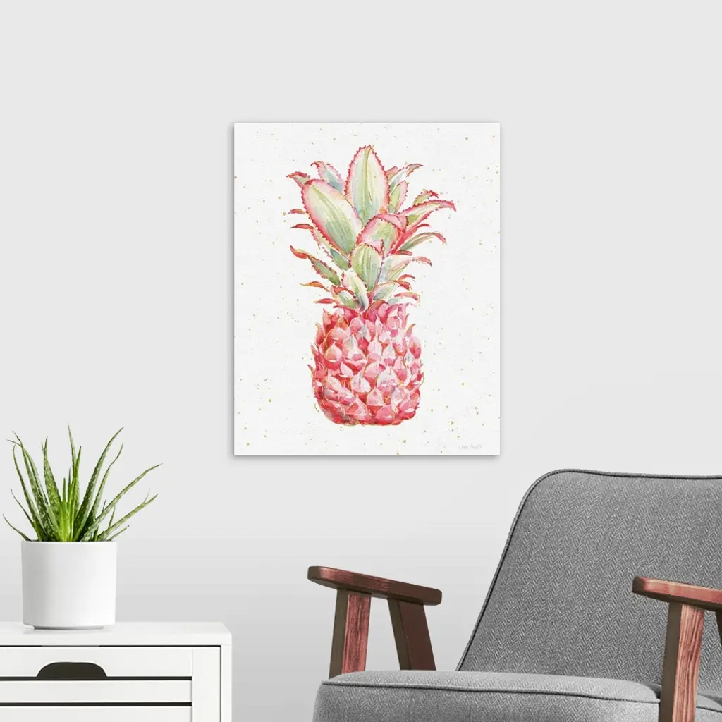 A tropical watercolor painting of a pink pineapple with metallic gold highlights and dots.
