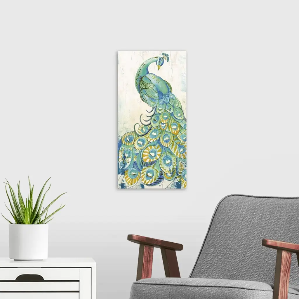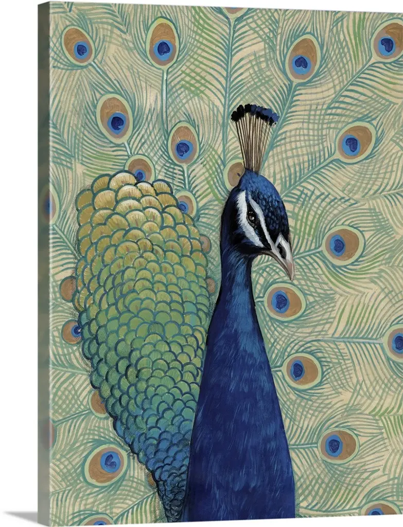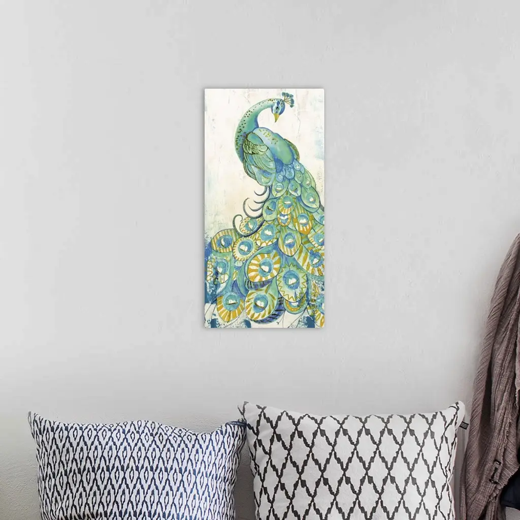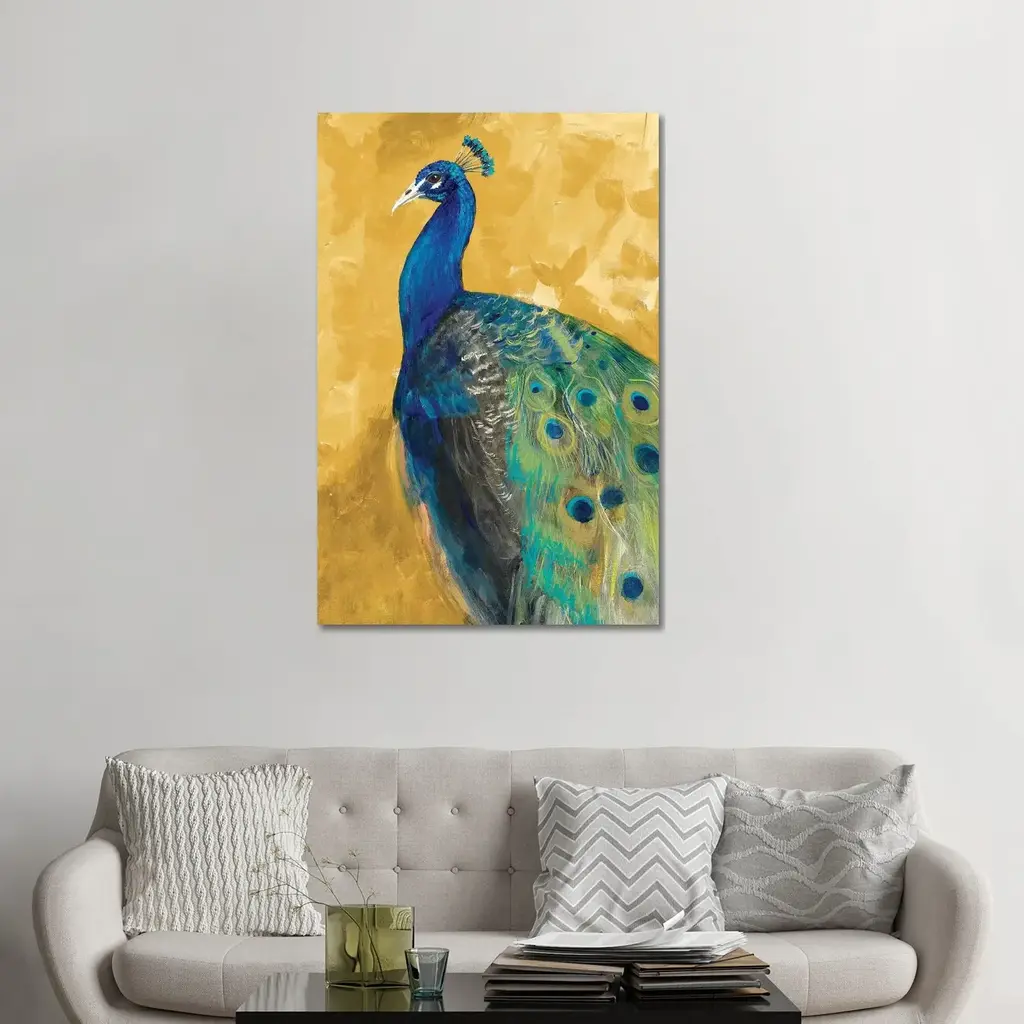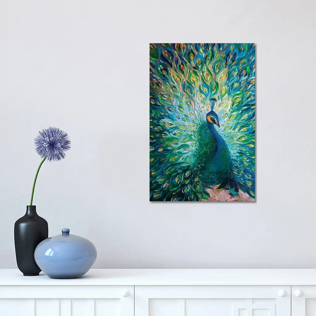 A contemporary painting of a peacock with beautifully decorated tail feathers that spread to the bottom of the canvas.