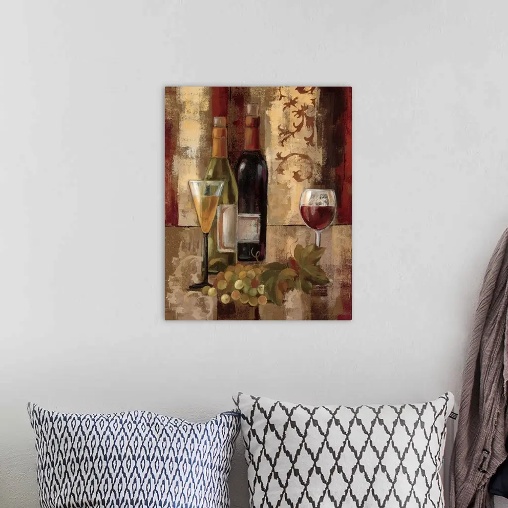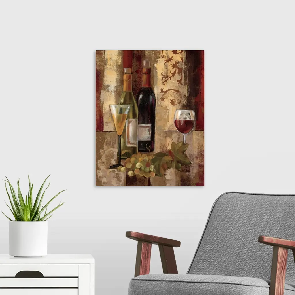 Decorative painting of a still life of two wine bottles and glasses of red and white wine, next to a bunch of grapes, on a textured background.