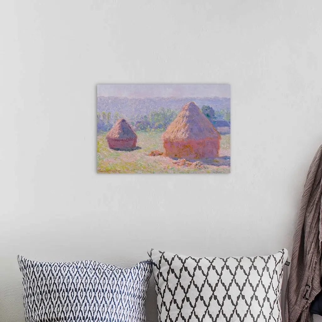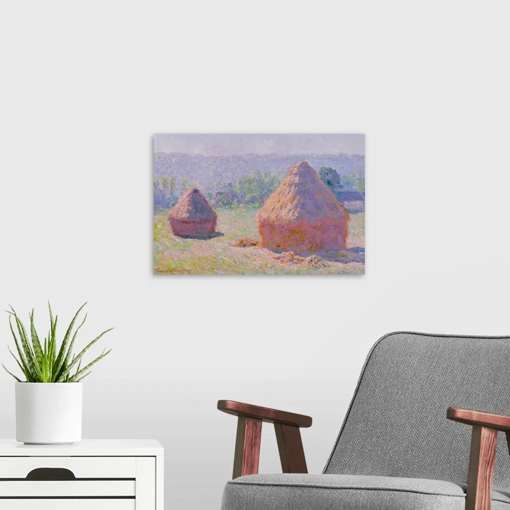 A classic piece of artwork that shows two large grain stacks in an open field.