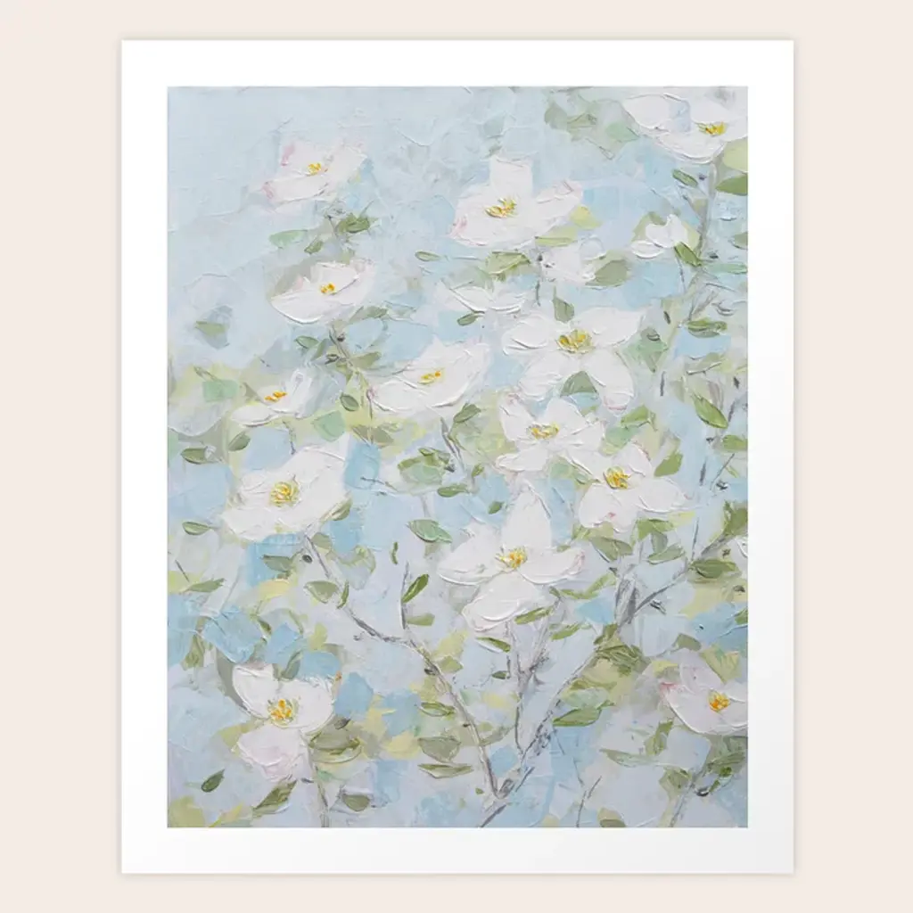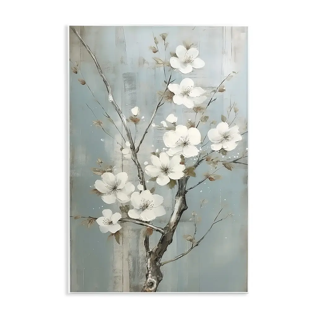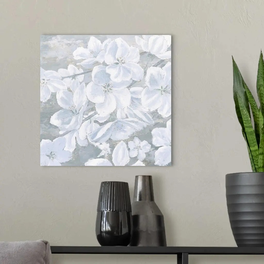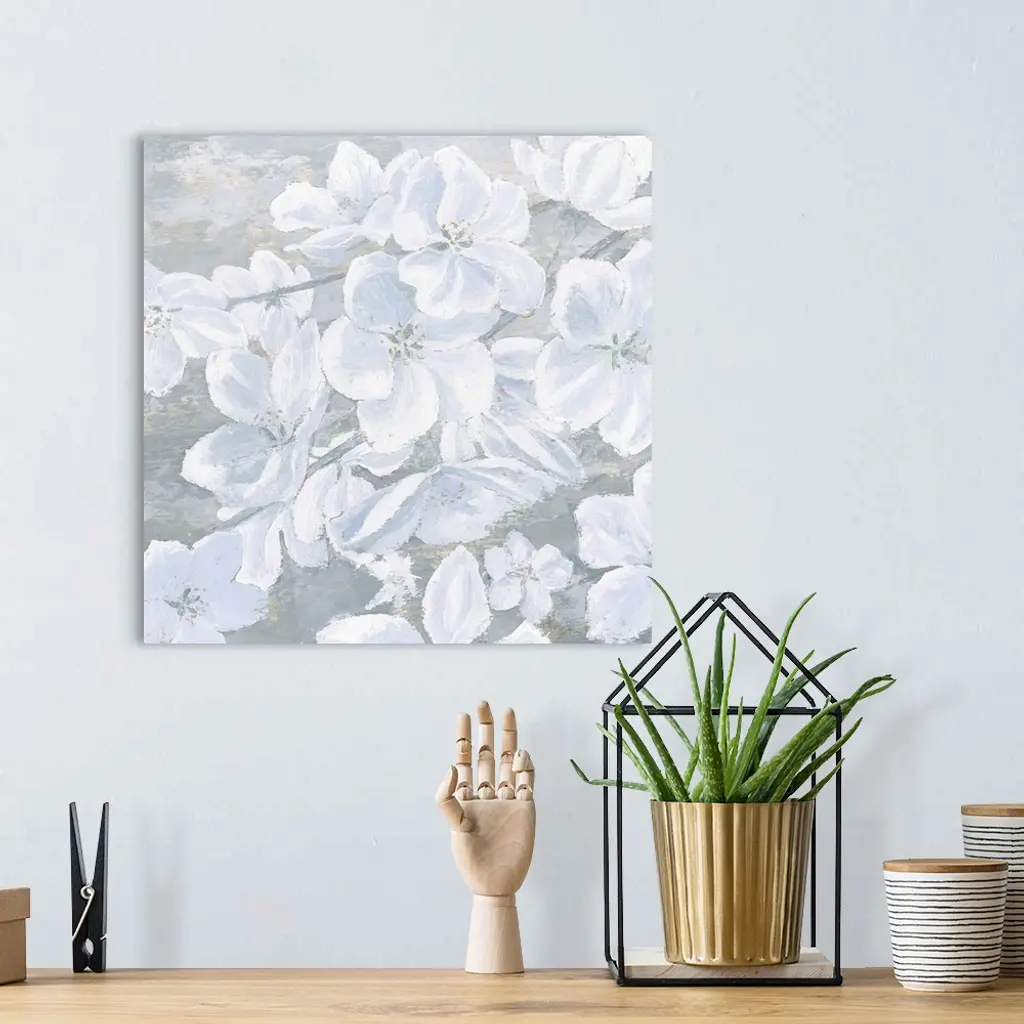 Square painting of cool toned white flowers on a slate blue and grey background.