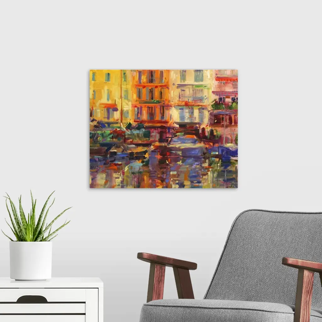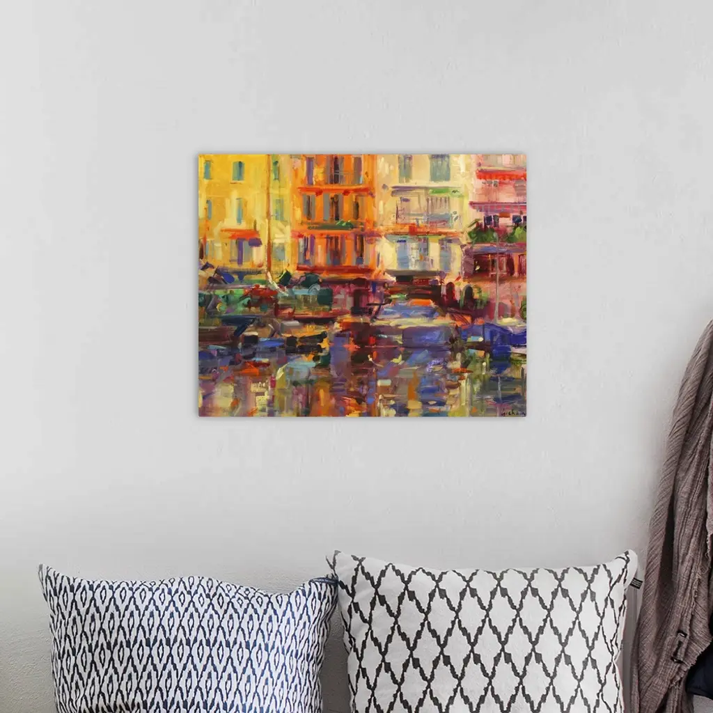 Contemporary art painting of buildings overlooking a boat filled harbor.