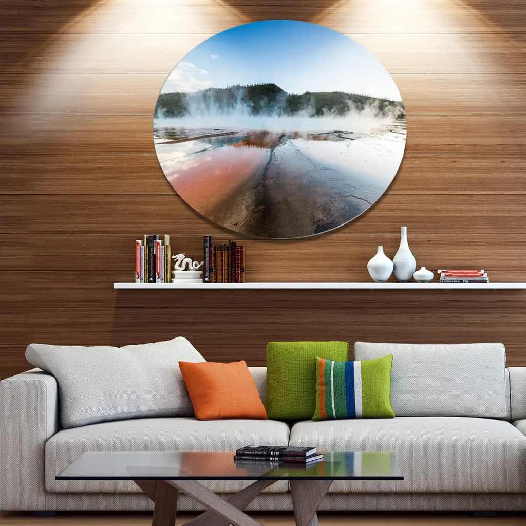Bring Contemporary Abstraction to your home with this large Circle Metal wall art. This Grand Prismatic Spring at Sunset Metal Artwork makes it the focal point of any room or office. - White Gloss Coating ensures colors are extra vibrant with light reflection.- Aluminum grade Sheet Metal with 1 inch mounting frame on the back giving the illusion that the artwork is floating on the wall..- Mounting Brackets are included along with instructions.- High Quality Digital images are created directly into a glossy aluminum panel producing a stunning and captivating print into the glossy finish of the metal.- Water, Fire and Scratch resistant HD Aluminum panels.- Looks better than any photo paper and guaranteed to last at least 20 years- Easy to clean with a microfiber cloth. Colors are far superior to regular Canvas Art. - Easy to Hang