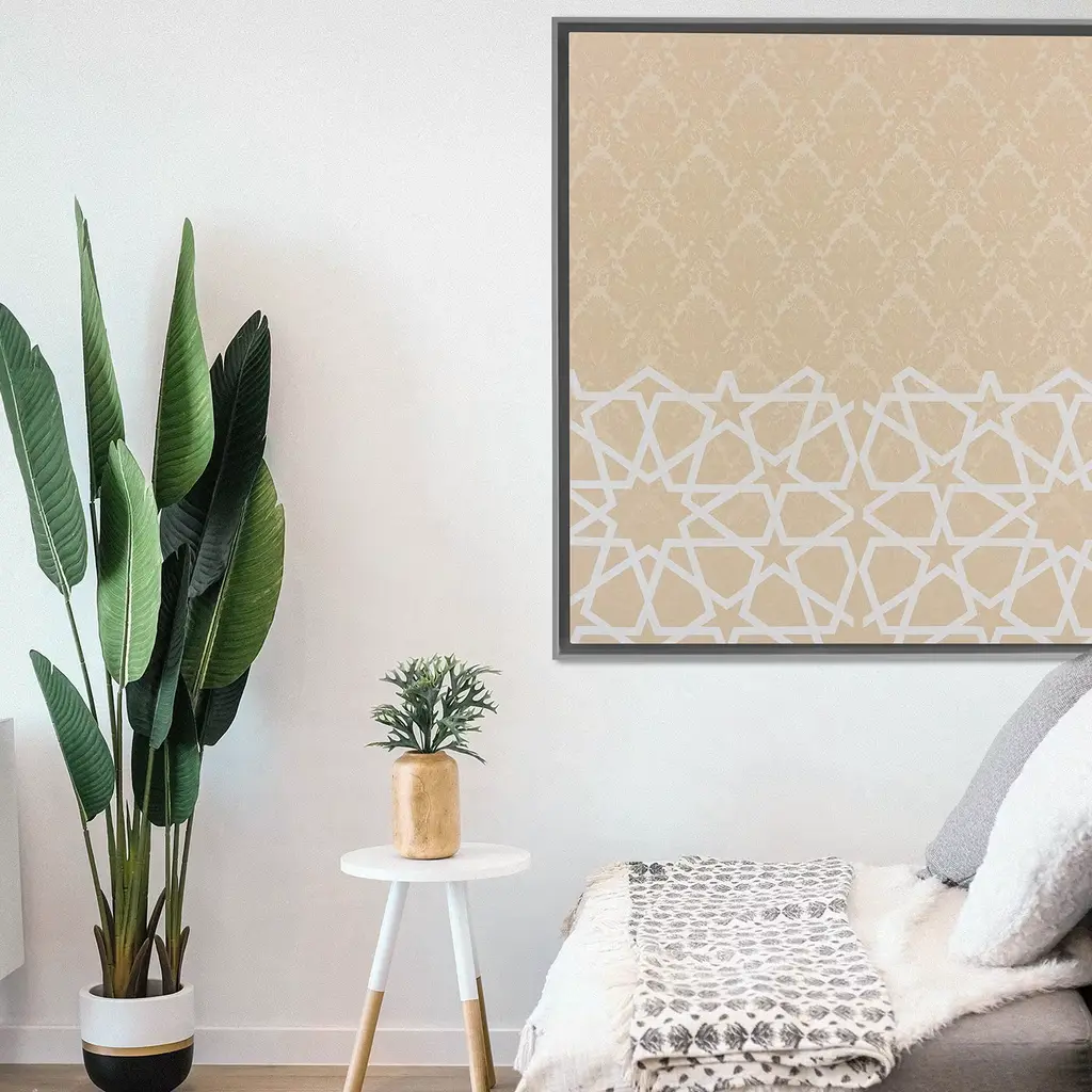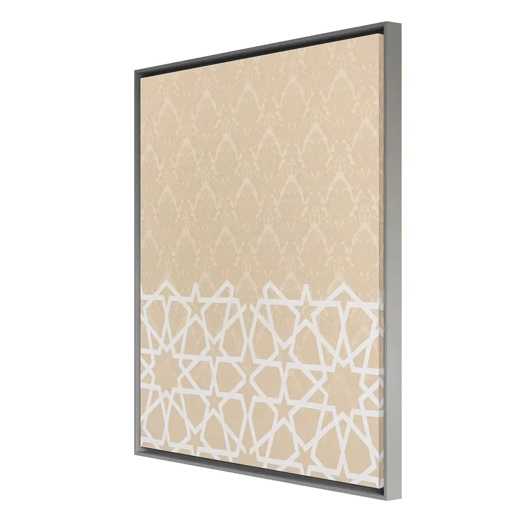A harmonious interaction between art and craftsmanship marks this stunning decorative panel by Amelia Corvino. Crafted in the most prestigious Venetian weaver's shops, it is fashioned of beige damask and internally filled with fine cotton. Just like a musical counterpoint ("contrappunto" in Italian), the piece boasts a unique motif that combines the typical western, damask pattern with an oriental geometric motif belonging to Islamic art. The wooden frame is available upon request.