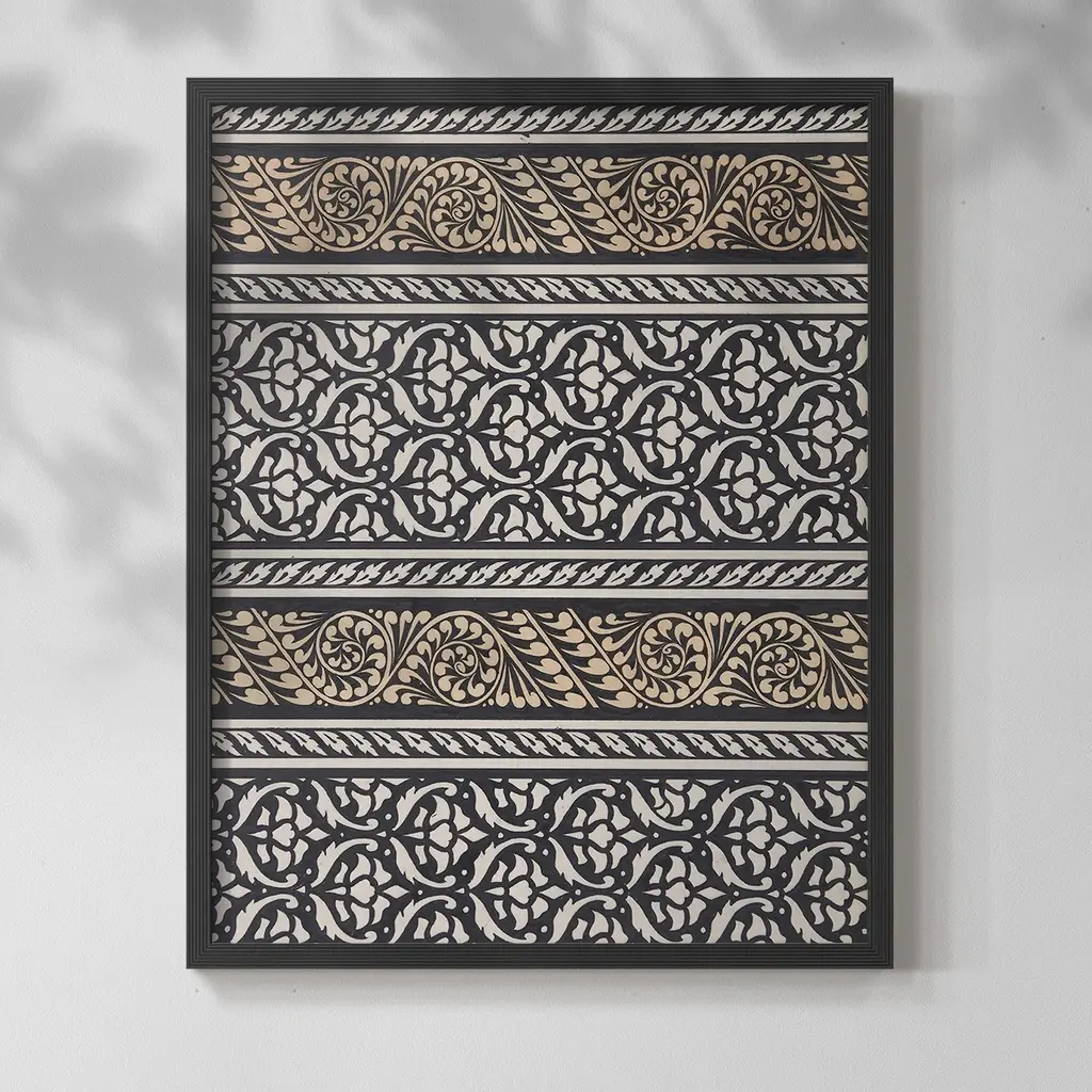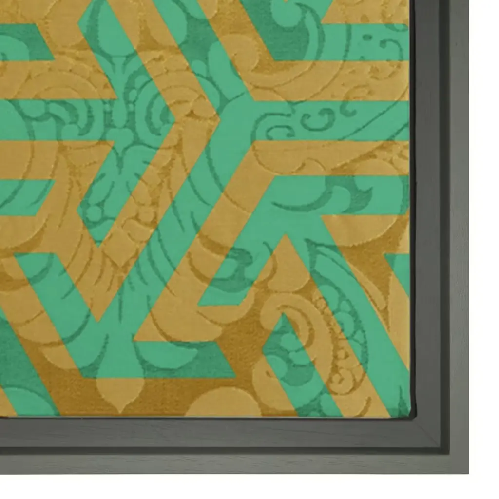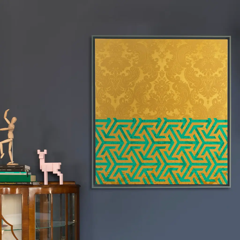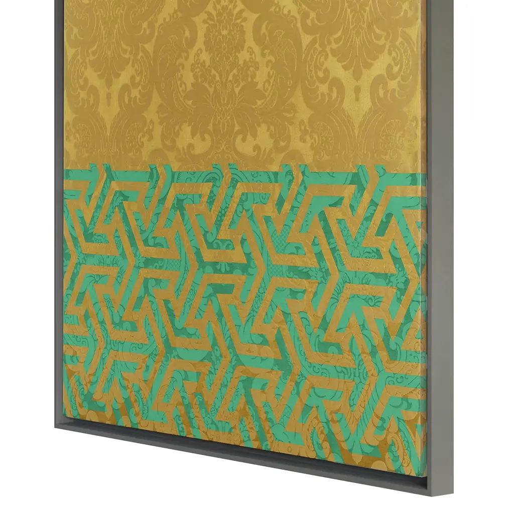 A harmonious interaction between art and craftsmanship marks this stunning decorative panel by Amelia Corvino. Crafted in the most prestigious Venetian weaver's shops, it is fashioned of gold damask and internally filled with fine cotton. Just like a musical counterpoint ("contrappunto" in Italian), the piece boasts a unique motif that combines the typical western, damask pattern with an oriental geometric motif belonging to Islamic art. The wooden frame is available upon request.