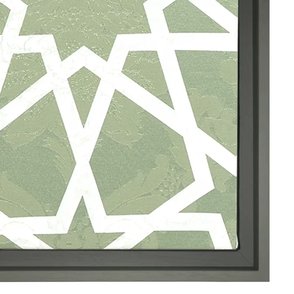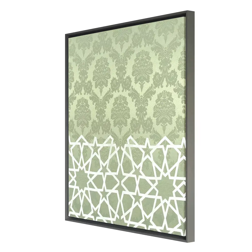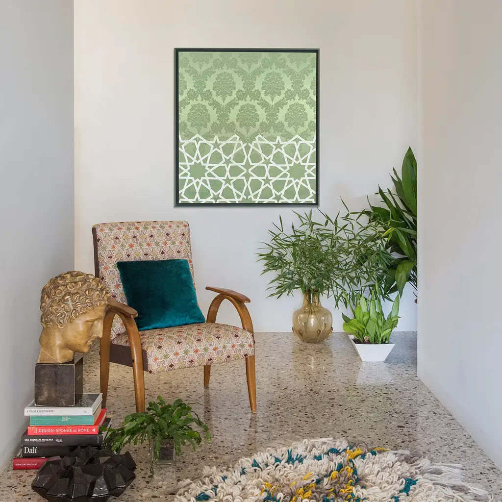 An impeccable piece of decor by Amelia Corvino, this panel is fashioned of a refined mint green damask coming from the most prestigious Venetian weaver's shops. Internally filled with fine cotton fabric, a wooden frame is available upon request. Reminiscent of the superb melodic combination known in music as a counterpoint ("contrappunto" in Italian), this piece functions as an artistic bridge between the East and the West, combining the typical damask pattern on its top part with an Islamic geometric motif on the bottom.