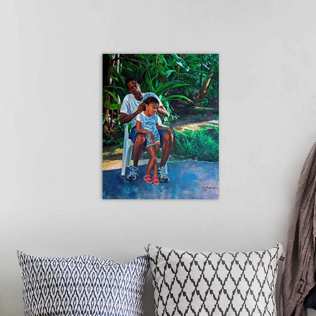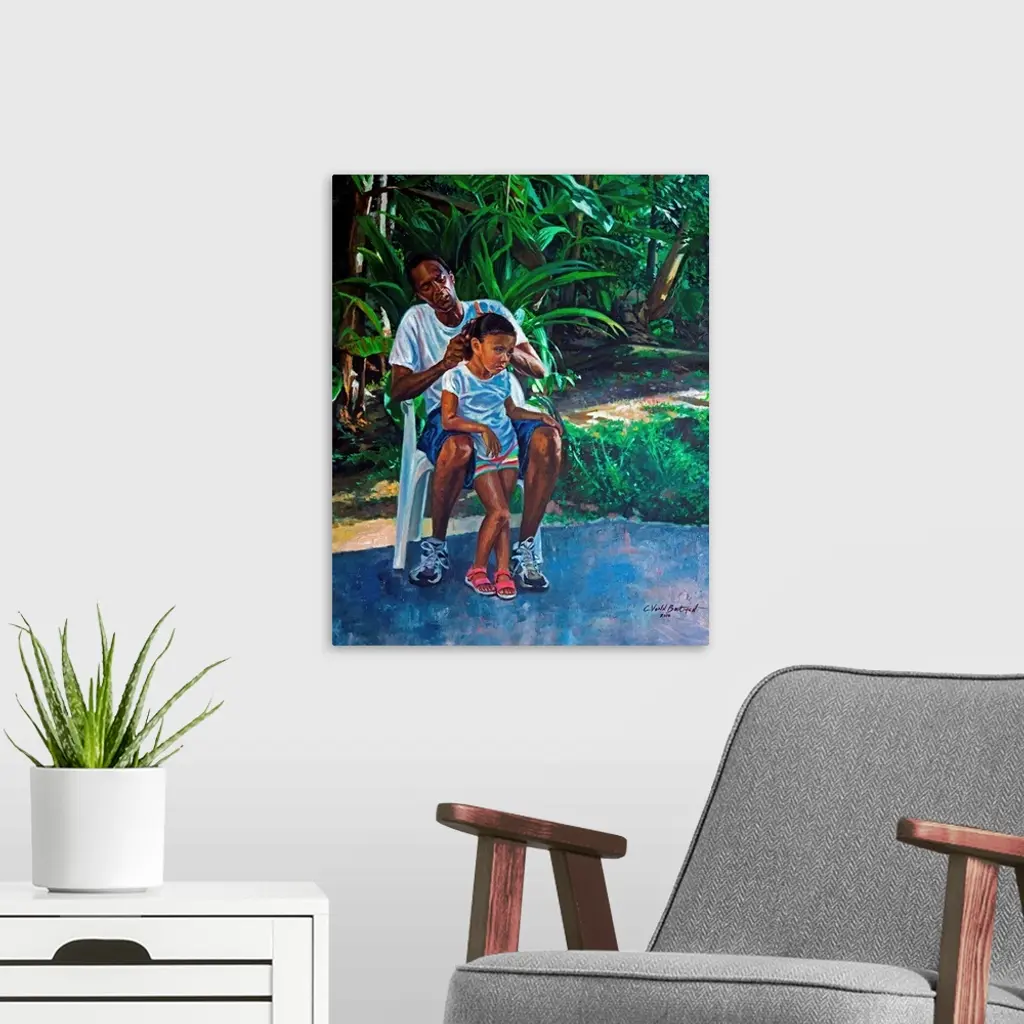 Contemporary painting of an older man braiding his granddaughter's hair.