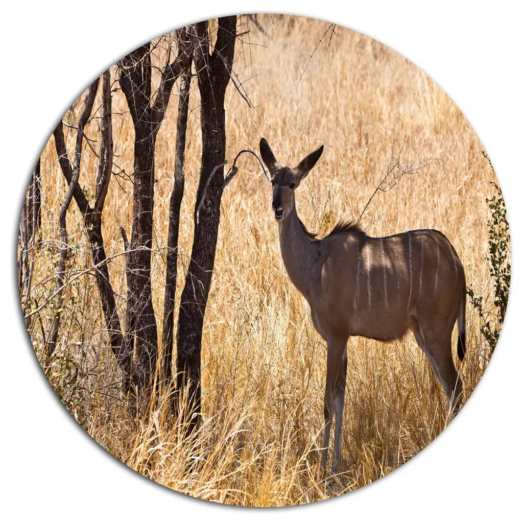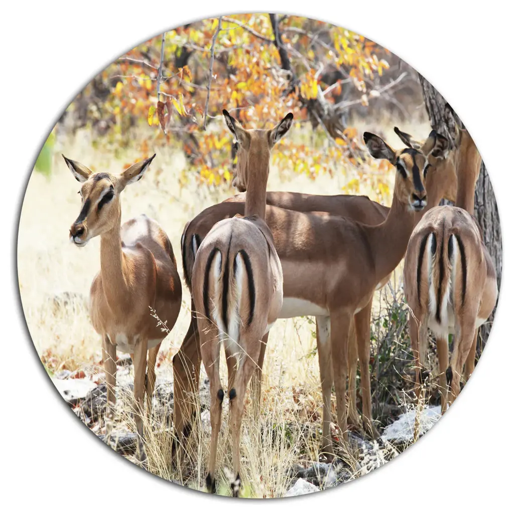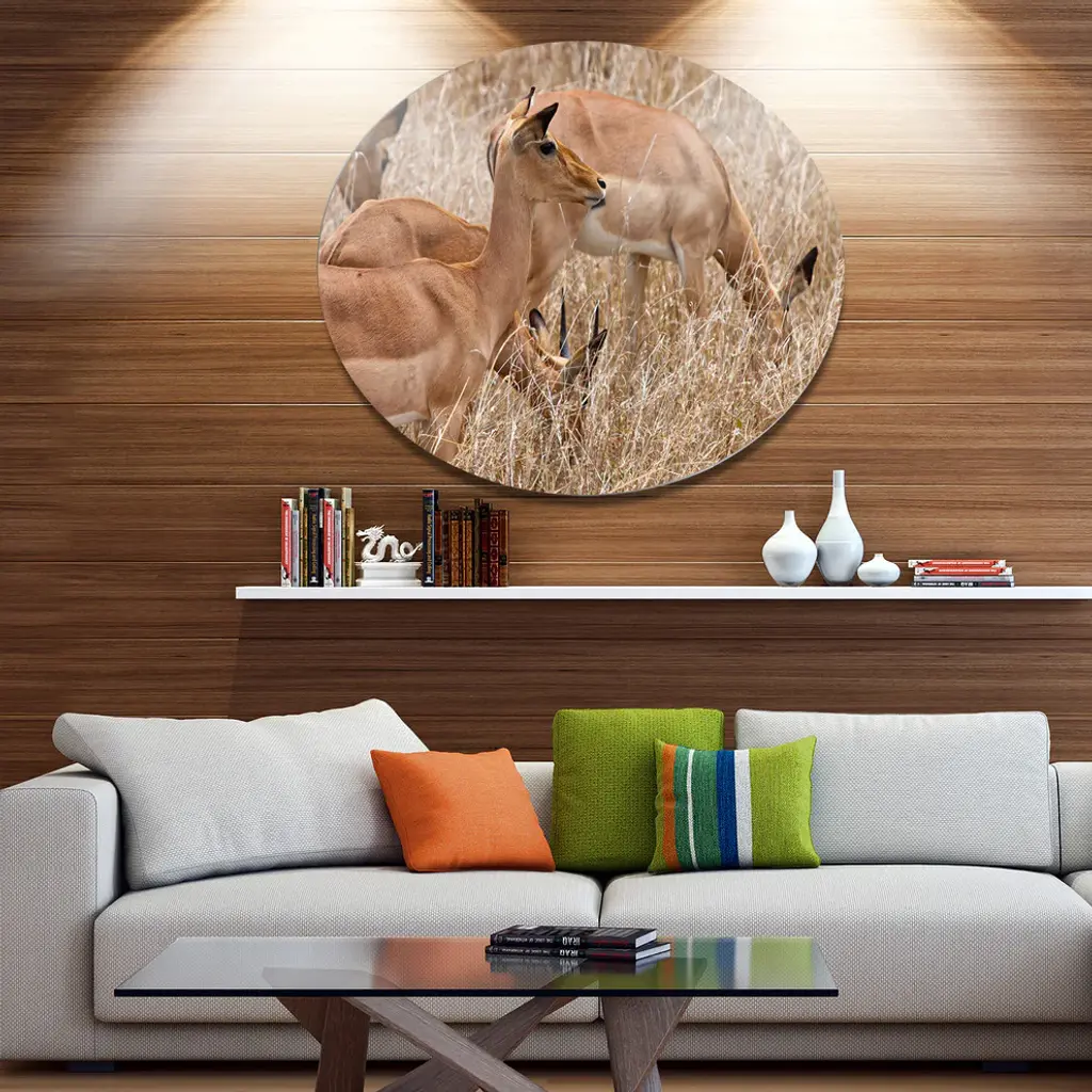 Bring Contemporary Abstraction to your home with this large Circle Metal wall art. This Grants Gazelles Grazing in Grassland Metal Artwork makes it the focal point of any room or office. - White Gloss Coating ensures colors are extra vibrant with light reflection.- Aluminum grade Sheet Metal with 1 inch mounting frame on the back giving the illusion that the artwork is floating on the wall..- Mounting Brackets are included along with instructions.- High Quality Digital images are created directly into a glossy aluminum panel producing a stunning and captivating print into the glossy finish of the metal.- Water, Fire and Scratch resistant HD Aluminum panels.- Looks better than any photo paper and guaranteed to last at least 20 years- Easy to clean with a microfiber cloth. Colors are far superior to regular Canvas Art. - Easy to Hang