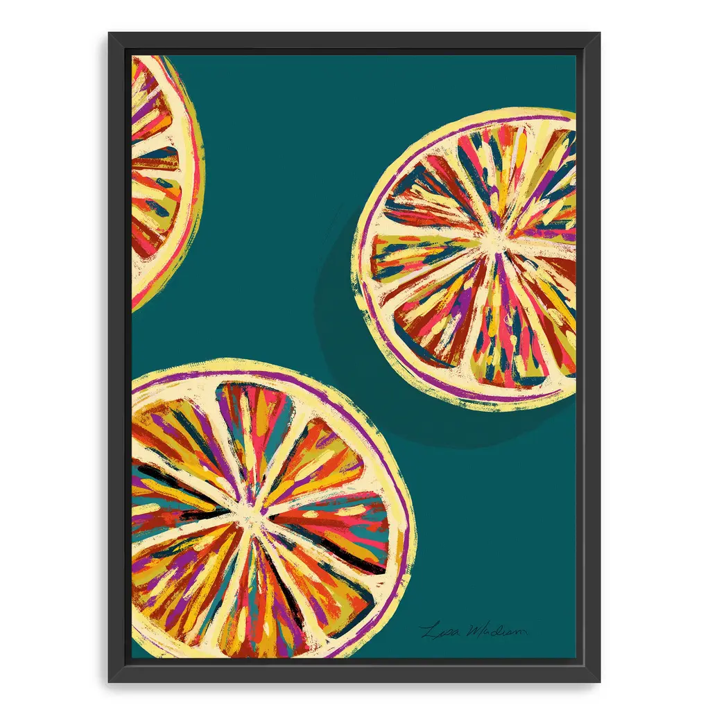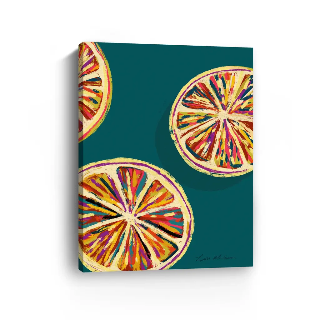 Add a burst of sunshine to your space with this vibrant citrus-inspired canvas, featuring abstract orange slices in juicy shades of red, pink, and gold against a cool teal backdrop. Perfect for kitchens, dining areas, or creative corners, this modern fruit wall art brings playful energy and artistic flair to any room Our Gallery Wrap Canvas Prints are proudly assembled with high quality materials in California, USA. Each piece is printed on a thick, archival grade canvas using Giclee technology. It is then hand-stretched by our experienced artisans over solid wood bars, which will not warp over time. The final product is a piece personally crafted for you to confidently display on your wall. Care and Assembly: Ensure that the location of your piece has little to no exposure to heat, sunlight, and moisture. Wipe clean, only if needed. Each piece includes hanging hardware to hang on your wall vertically.