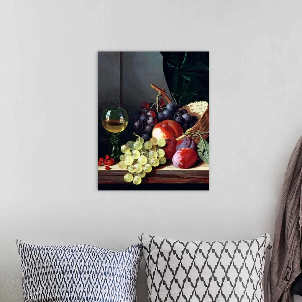 Painting of a basket of fruit and a glass on wine on a table. Some of the fruit included are peaches and cherries.