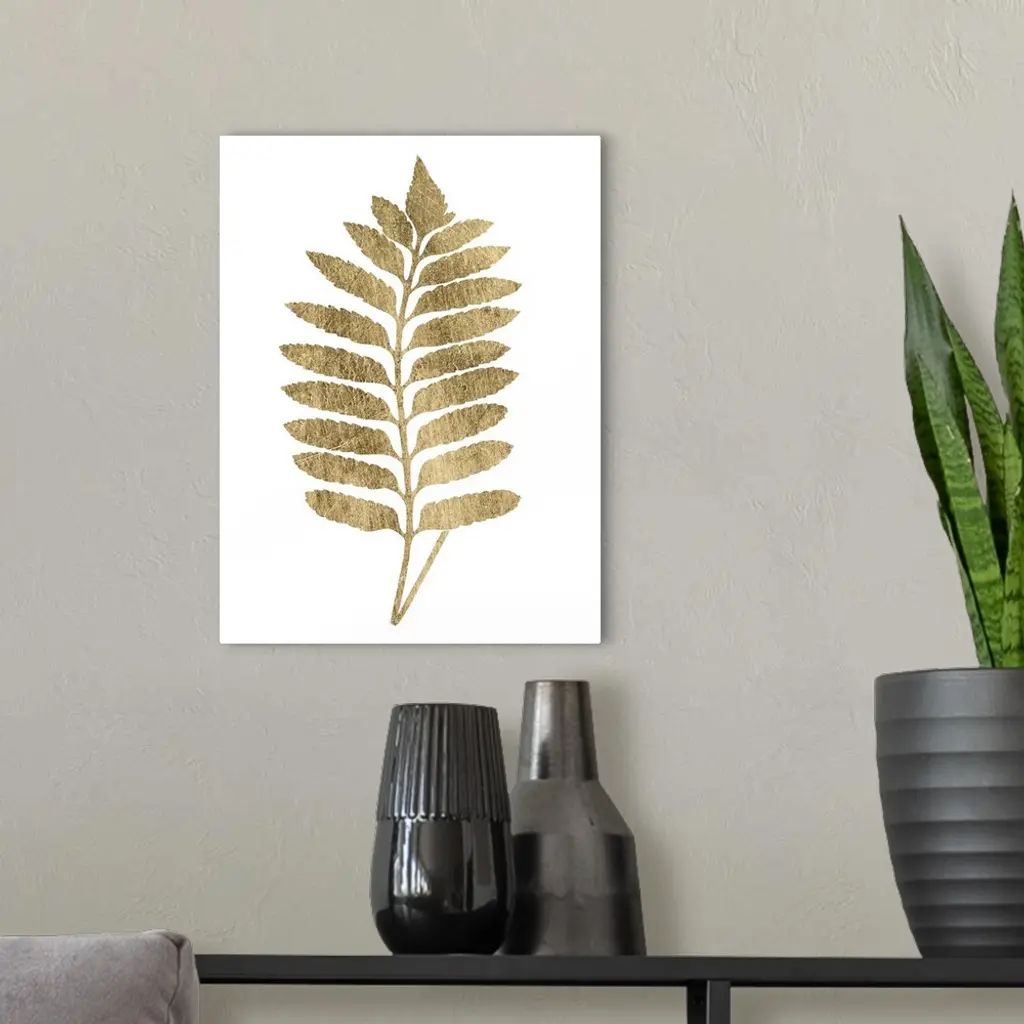 Contemporary artwork of a gold fern frond against a white background.
