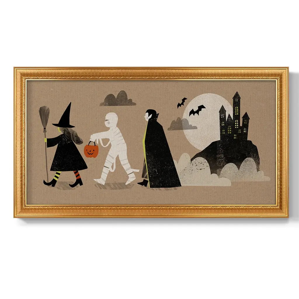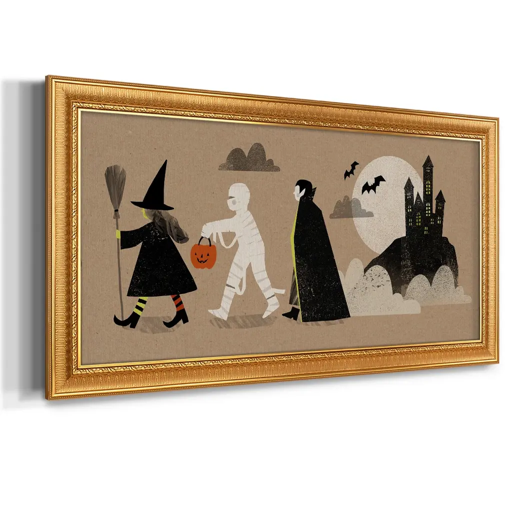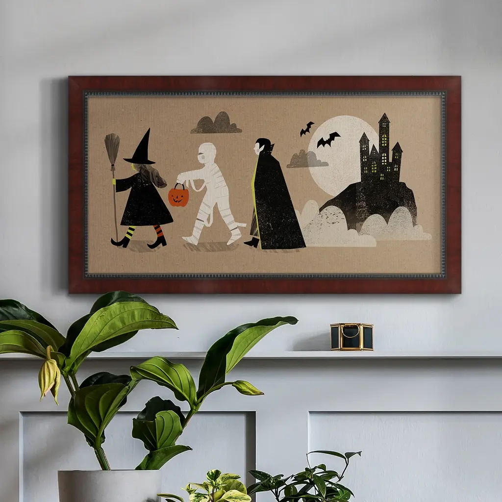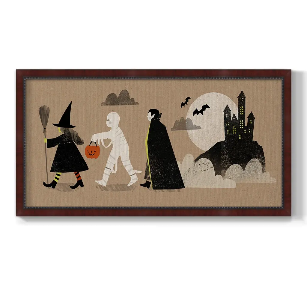 Graphic Halloween Collection D Premium Framed Canvas- Ready to Hang A Premium Framed Canvas created to last. Framed in distressed wood and available in an array of sizes and colors Featuring a beveled a solid wood stretcher bar, each piece comes ready to hand 3 SIZES AVAILABLE 21''X37'' - Overall Size 25''X45'' - Overall Size 29''x53'' - Overall Size Each piece is made to order. Each piece comes with hanging hardware. Made in the USA Ready to Hang Giclee Paper Print Acrylic Glass Beveled Matt Board