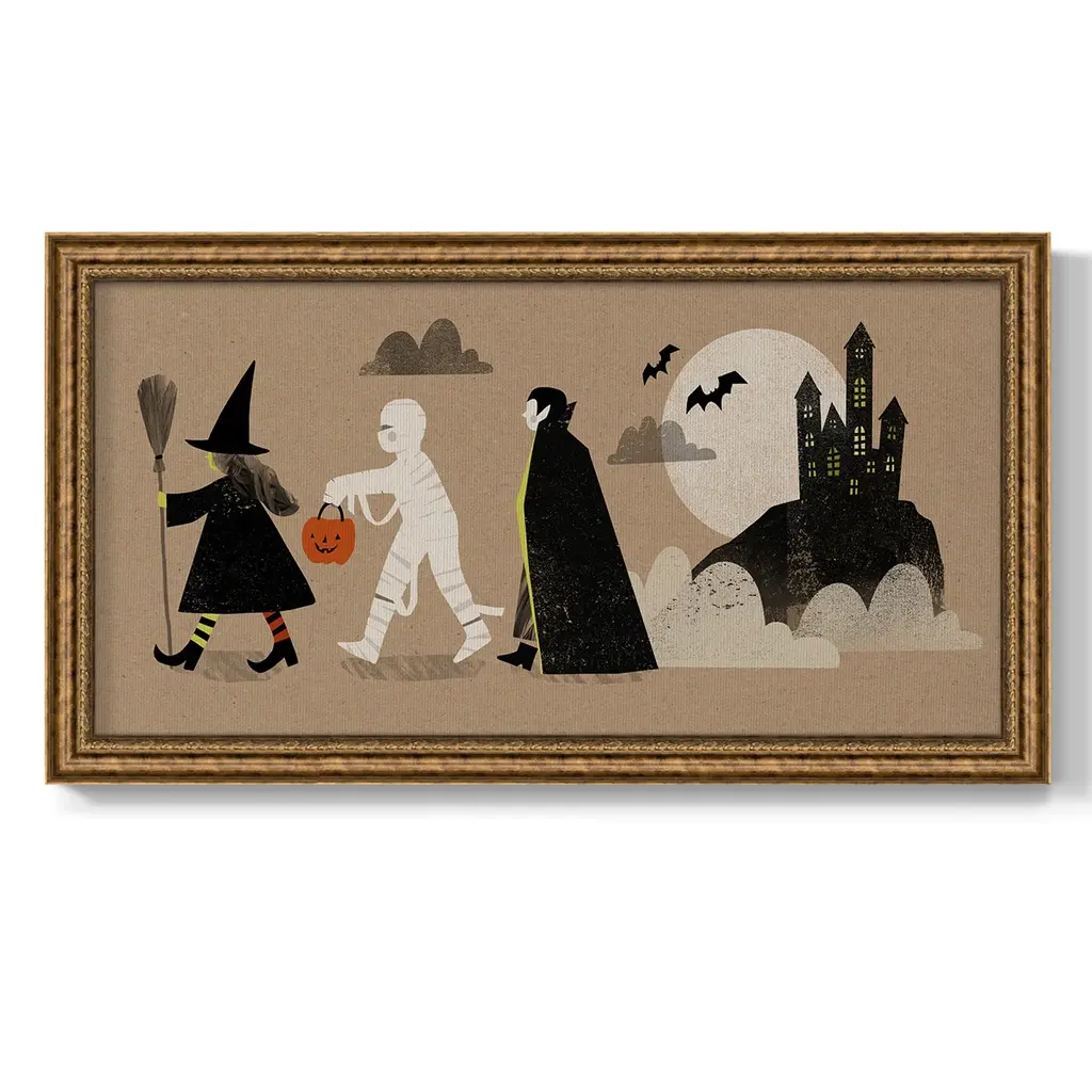 Graphic Halloween Collection D Premium Framed Canvas- Ready to Hang A Premium Framed Canvas created to last. Framed in distressed wood and available in an array of sizes and colors Featuring a beveled a solid wood stretcher bar, each piece comes ready to hand 3 SIZES AVAILABLE 21''X37'' - Overall Size 25''X45'' - Overall Size 29''x53'' - Overall Size Each piece is made to order. Each piece comes with hanging hardware. Made in the USA Ready to Hang Giclee Paper Print Acrylic Glass Beveled Matt Board