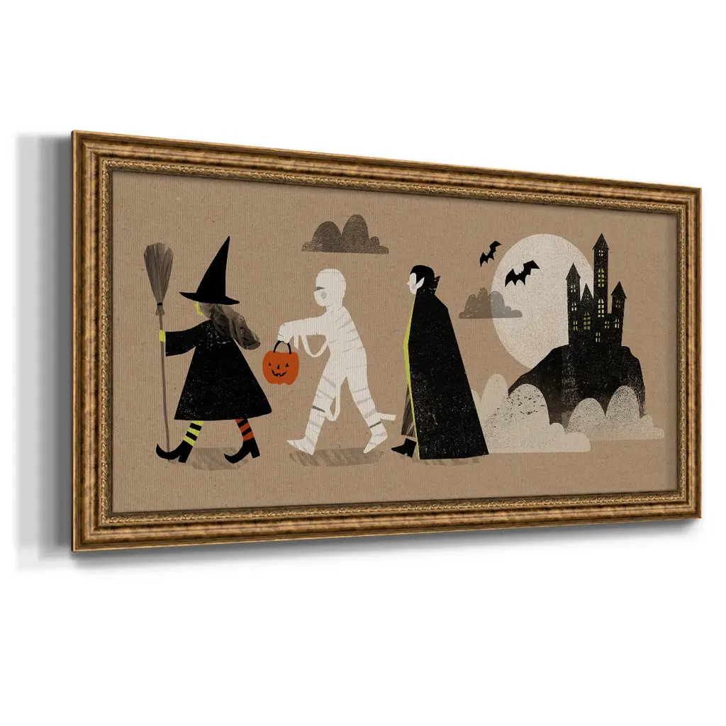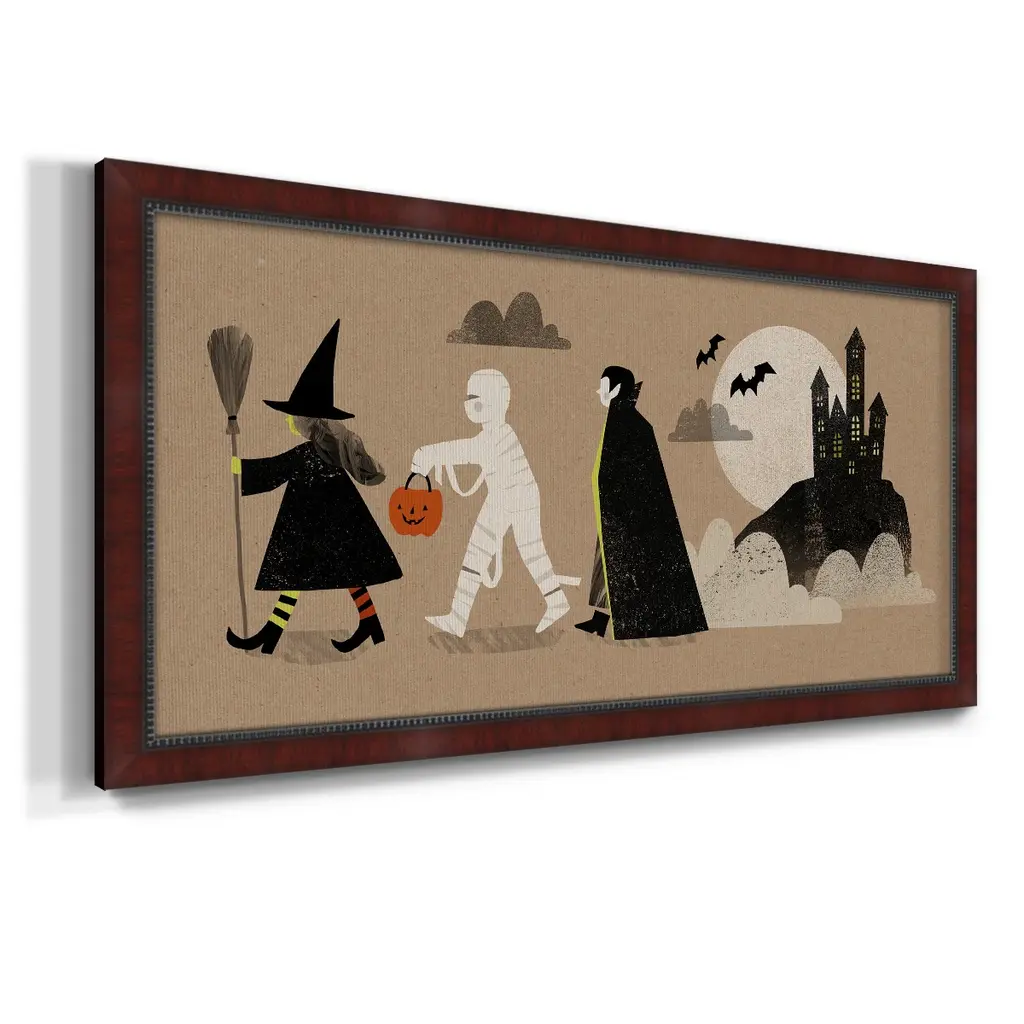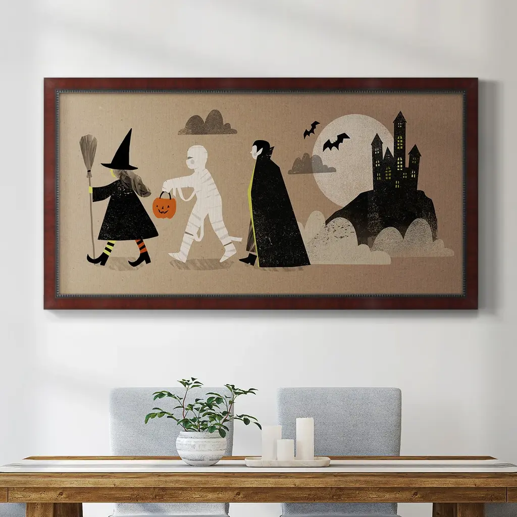 Graphic Halloween Collection D Premium Framed Canvas- Ready to Hang A Premium Framed Canvas created to last. Framed in distressed wood and available in an array of sizes and colors Featuring a beveled a solid wood stretcher bar, each piece comes ready to hand 3 SIZES AVAILABLE 21''X37'' - Overall Size 25''X45'' - Overall Size 29''x53'' - Overall Size Each piece is made to order. Each piece comes with hanging hardware. Made in the USA Ready to Hang Giclee Paper Print Acrylic Glass Beveled Matt Board