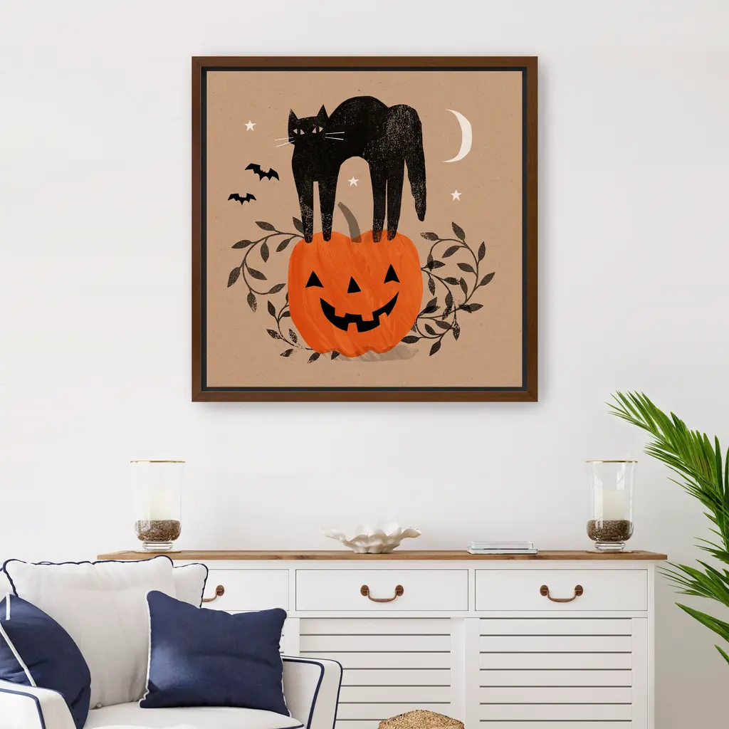 A sleek black cat perches proudly atop a glowing jack"‘o"‘lantern, framed by the warm, earthy tones of a taupe twilight sky. Orange, black, and dark beige hues create a cozy yet mysterious Halloween scene. Our Gallery Wrap Canvas Prints are proudly assembled with high quality materials in California, USA. Each piece is printed on a thick, archival grade canvas using Giclee technology. It is then hand-stretched by our experienced artisans over solid wood bars, which will not warp over time. The final product is a piece personally crafted for you to confidently display on your wall. Care and Assembly: Ensure that the location of your piece has little to no exposure to heat, sunlight, and moisture. Wipe clean, only if needed. Each piece includes hanging hardware to hang on your wall horizontally.