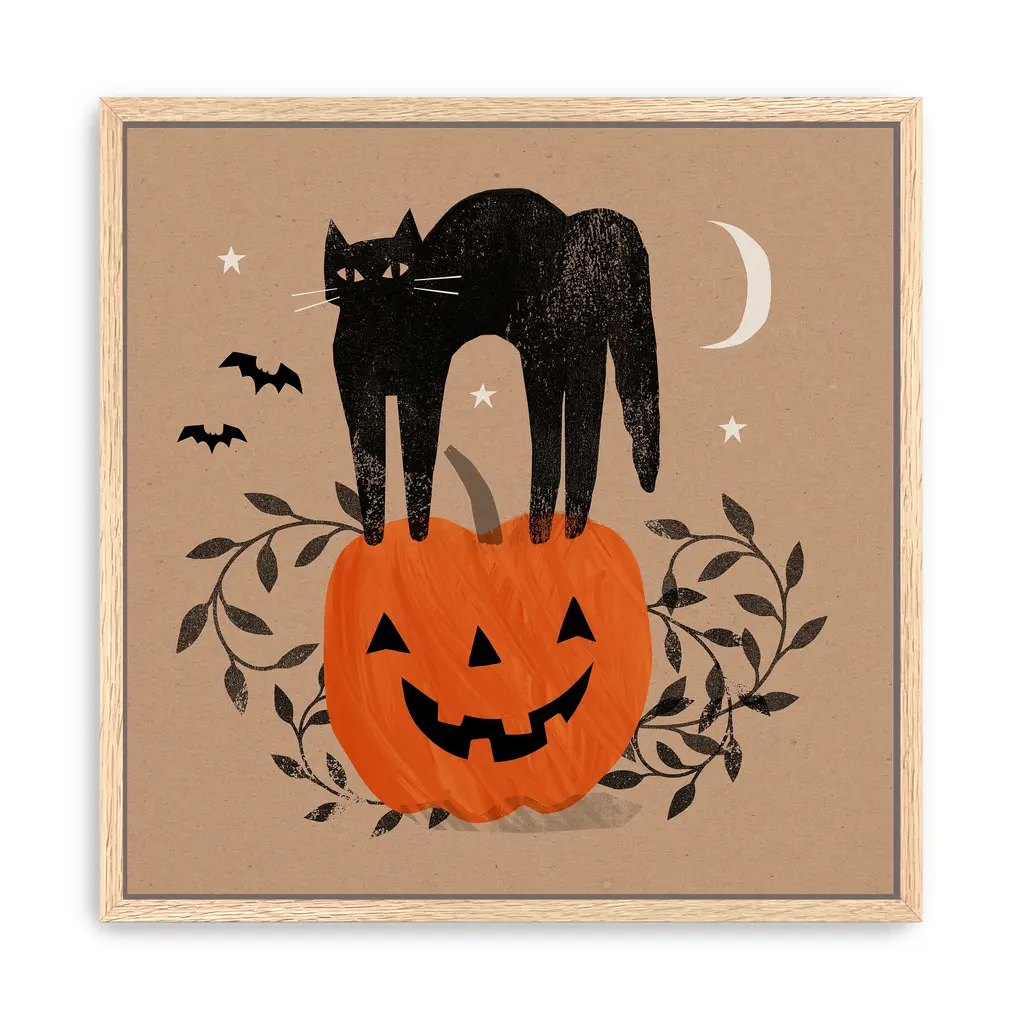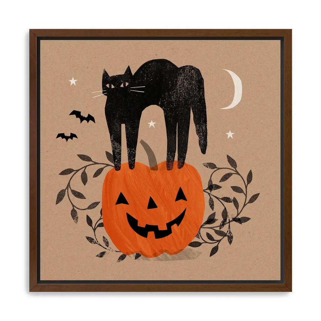 A sleek black cat perches proudly atop a glowing jack"‘o"‘lantern, framed by the warm, earthy tones of a taupe twilight sky. Orange, black, and dark beige hues create a cozy yet mysterious Halloween scene. Our Gallery Wrap Canvas Prints are proudly assembled with high quality materials in California, USA. Each piece is printed on a thick, archival grade canvas using Giclee technology. It is then hand-stretched by our experienced artisans over solid wood bars, which will not warp over time. The final product is a piece personally crafted for you to confidently display on your wall. Care and Assembly: Ensure that the location of your piece has little to no exposure to heat, sunlight, and moisture. Wipe clean, only if needed. Each piece includes hanging hardware to hang on your wall horizontally.