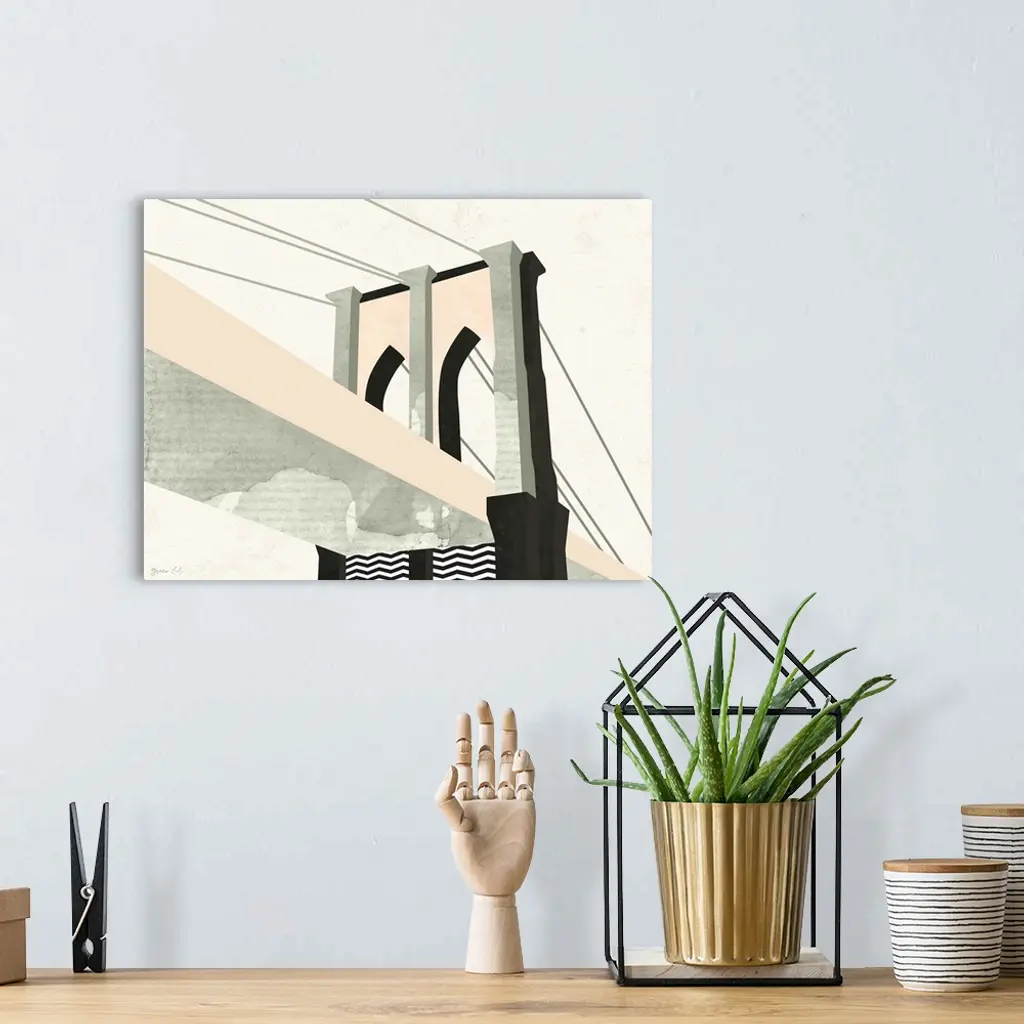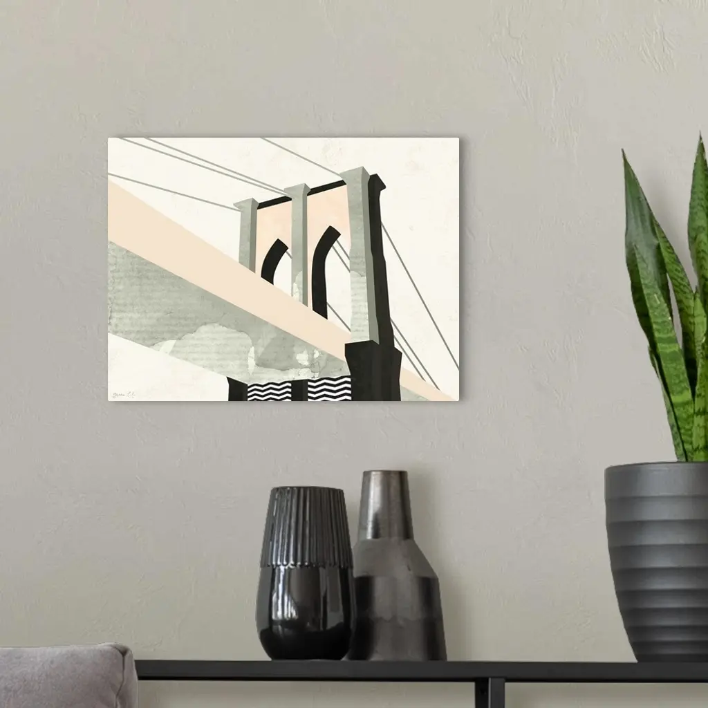 Minimalist geometric artwork in black and pale pink of the stylized Brooklyn Bridge.
