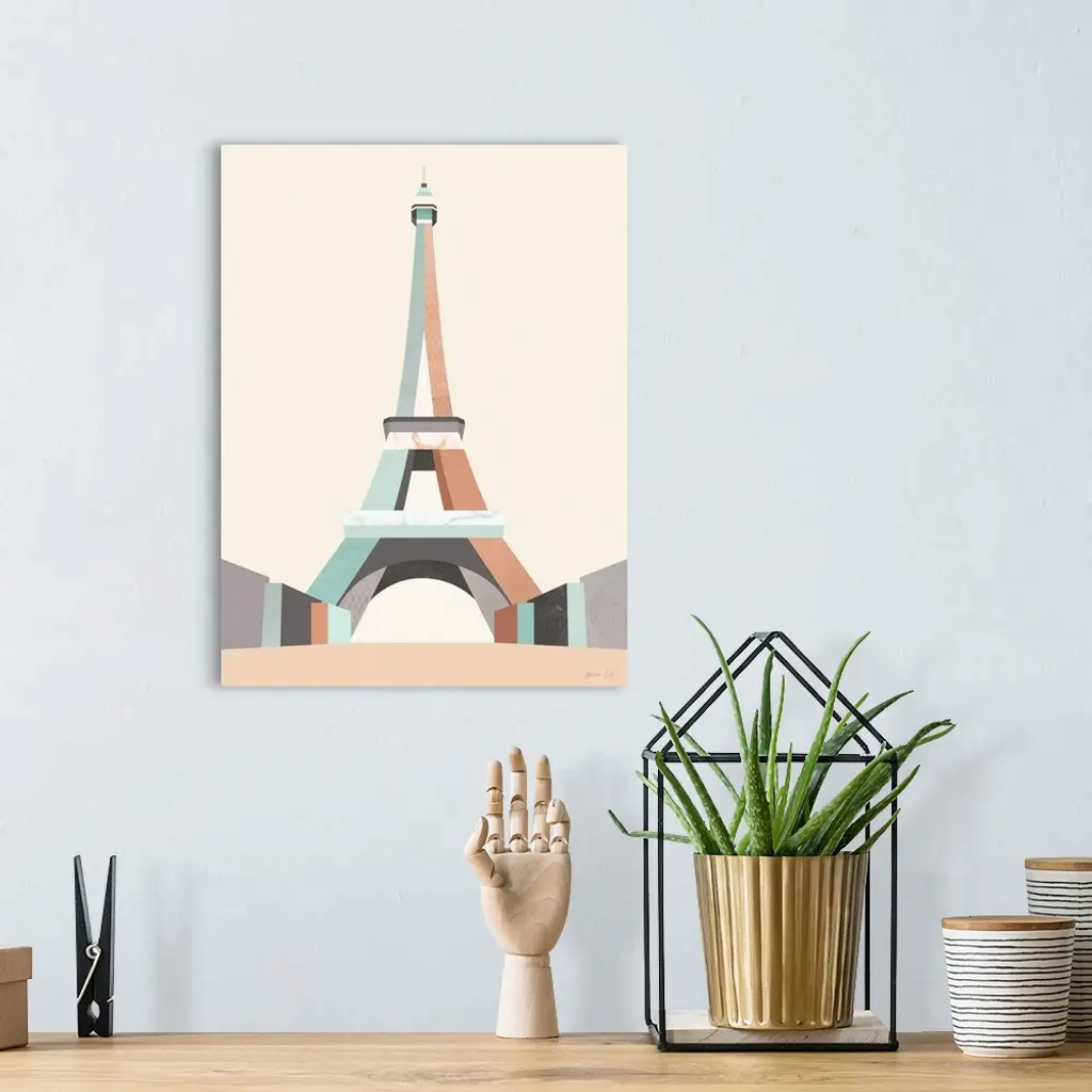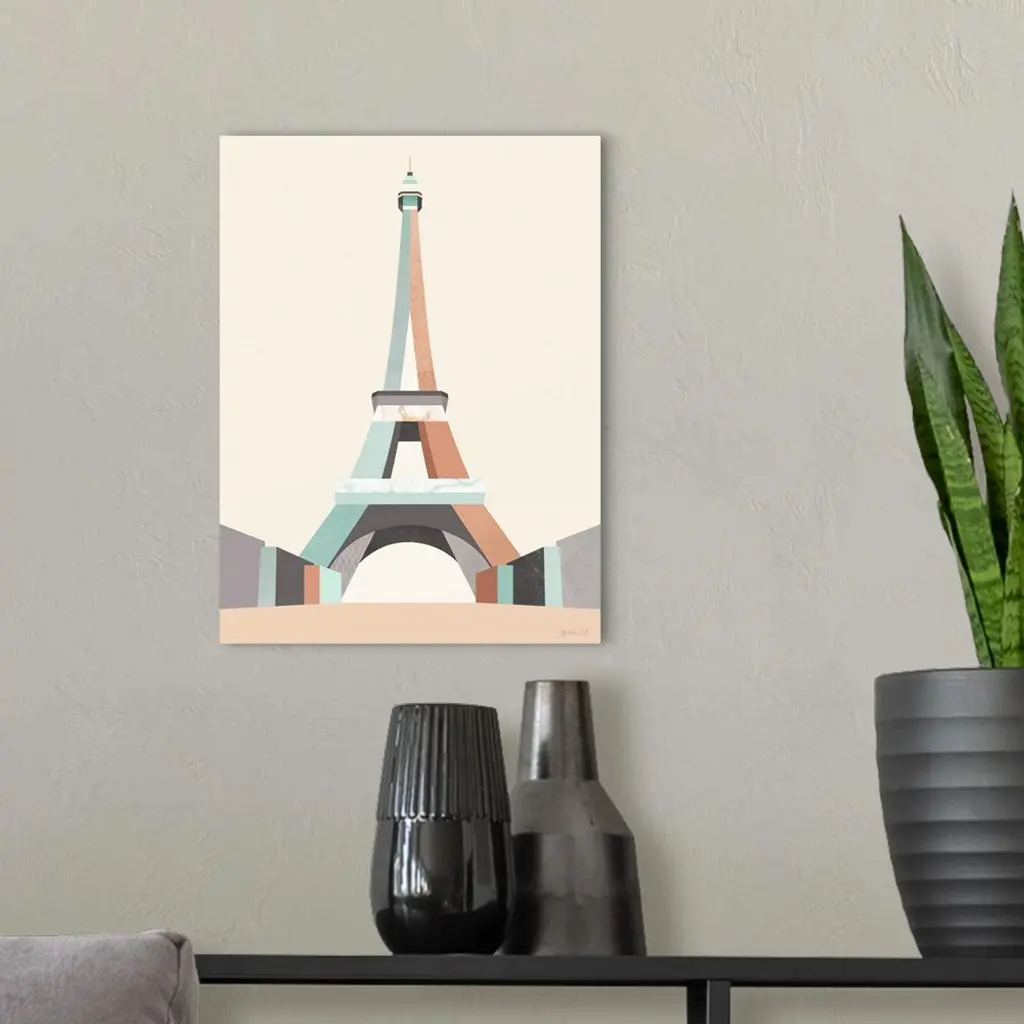Minimalist geometric artwork in blue and coral of a stylized Eiffel Tower.